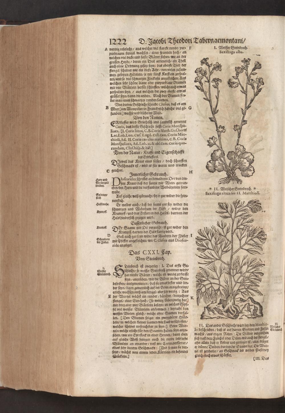 D. Jacobi Theodori Tabernaemontani, Neu vollkommen Kräuter-Buch : Darinnen Uber 3000. Kräuter/ mit schönen und kunstlichen Figuren/ auch deren Underscheid und Würckung/ samt ihren Namen in mancherley Sprachen/ beschrieben: Desgleichen auch/ wie dieselbige in allerhand Kranckheiten/ beyde der Menschen und des Viehs/ sollen angewendet und gebraucht werden/ angezeigt wird. Erstlichen durch Casparum Bauhinum D. und Profess. Basil. mit vielen neuen Figuren/ nutzlichen Artzneyen/ und anderem/ mit sonderem Fleis gebesseret/ Zum Andern Durch Hieronymum Bauhinum D. und Profess. Basil. mit sehr nutzlichen Marginalien, Synonimis, neuen Registeren und anderem vermehrt