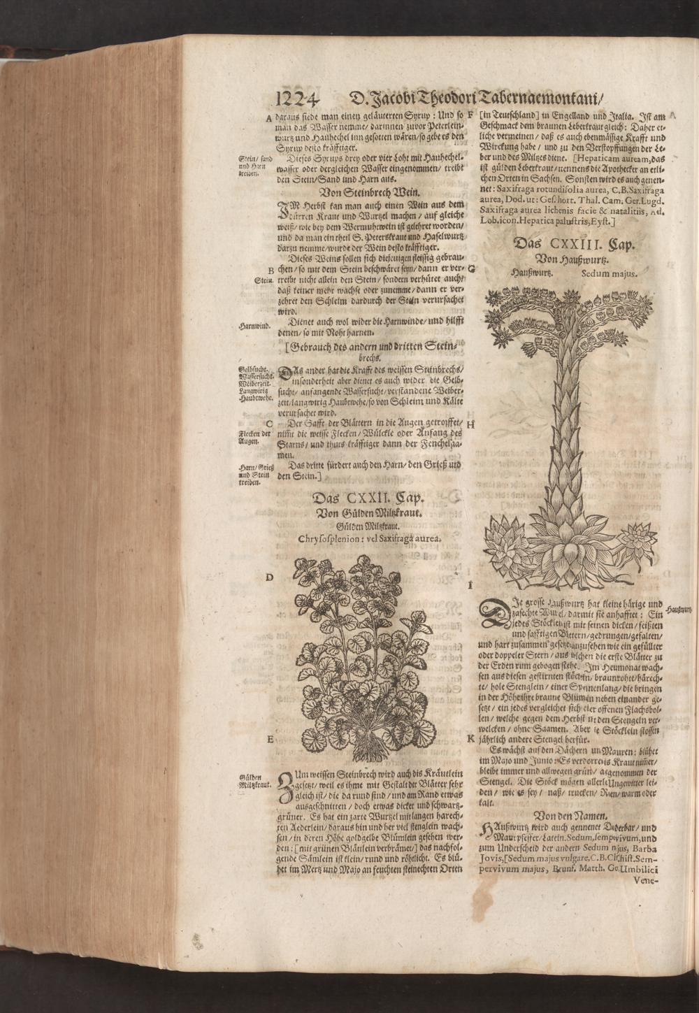 D. Jacobi Theodori Tabernaemontani, Neu vollkommen Kräuter-Buch : Darinnen Uber 3000. Kräuter/ mit schönen und kunstlichen Figuren/ auch deren Underscheid und Würckung/ samt ihren Namen in mancherley Sprachen/ beschrieben: Desgleichen auch/ wie dieselbige in allerhand Kranckheiten/ beyde der Menschen und des Viehs/ sollen angewendet und gebraucht werden/ angezeigt wird. Erstlichen durch Casparum Bauhinum D. und Profess. Basil. mit vielen neuen Figuren/ nutzlichen Artzneyen/ und anderem/ mit sonderem Fleis gebesseret/ Zum Andern Durch Hieronymum Bauhinum D. und Profess. Basil. mit sehr nutzlichen Marginalien, Synonimis, neuen Registeren und anderem vermehrt