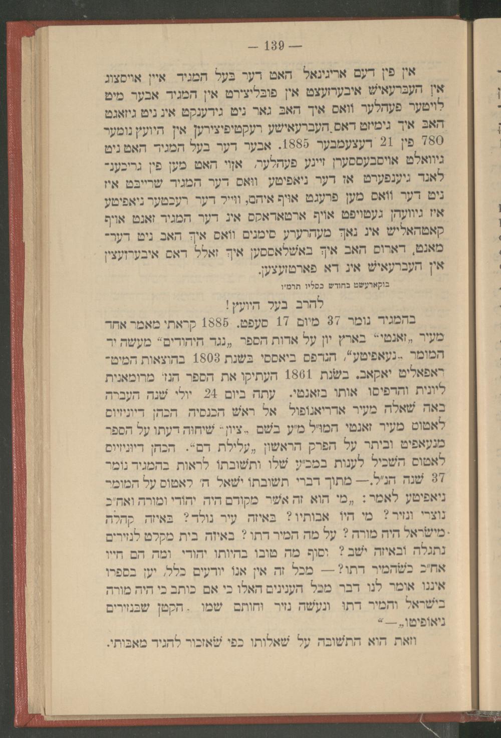 Seyfer zikhroynes̀ : oder, Biografishe beshraybung fin di alṭe layṭ ṿos zenin oyfgenemen geṿoren in Buḳaresṭer azil (bate maḥseh li-zeḳenim) fom yahre 1880 biz ende des yahres 1890 / me-et Yaʿaḳov Pesantir ; des seyfer werd ridikirṭ le-koved dem hisṭorishen farayn "Yulyus Barash" tsu Buḳareshṭספר זכרונות : אדער, ביאגראפישע בעשריבונג פין דיא אלטע לײט װאס זענין אױגענעמען געװארען אין בוקארעסטער אזיל (בתי מחסה לזקנים) פאם יאהרע 1880 ביז ענדע דעס יאהרעס 1890 / מאת יעקב פסנתר ; דאס ספר ווערד רידיקירט לכבוד דעס היסטארישען פעראיין "יוליאס באראש" צו בוקארעשט