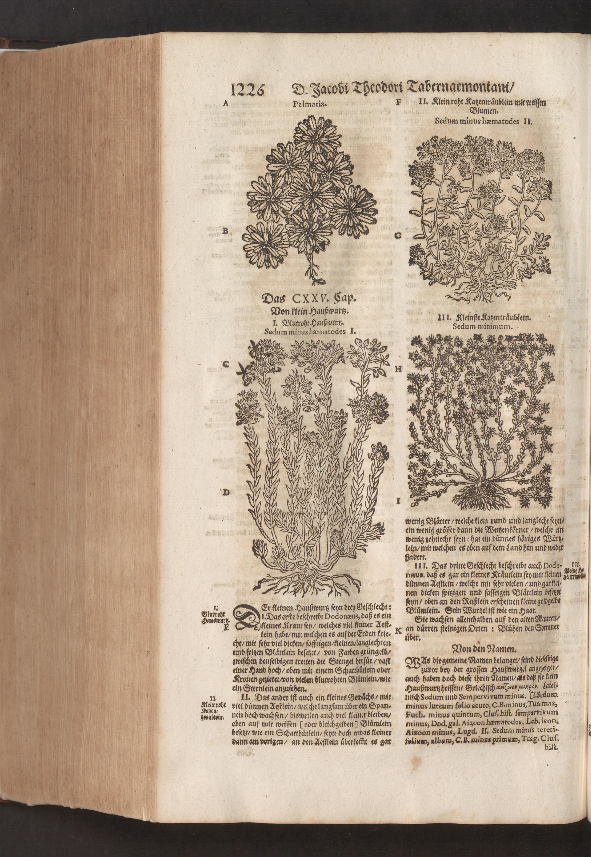 D. Jacobi Theodori Tabernaemontani, Neu vollkommen Kräuter-Buch : Darinnen Uber 3000. Kräuter/ mit schönen und kunstlichen Figuren/ auch deren Underscheid und Würckung/ samt ihren Namen in mancherley Sprachen/ beschrieben: Desgleichen auch/ wie dieselbige in allerhand Kranckheiten/ beyde der Menschen und des Viehs/ sollen angewendet und gebraucht werden/ angezeigt wird. Erstlichen durch Casparum Bauhinum D. und Profess. Basil. mit vielen neuen Figuren/ nutzlichen Artzneyen/ und anderem/ mit sonderem Fleis gebesseret/ Zum Andern Durch Hieronymum Bauhinum D. und Profess. Basil. mit sehr nutzlichen Marginalien, Synonimis, neuen Registeren und anderem vermehrt