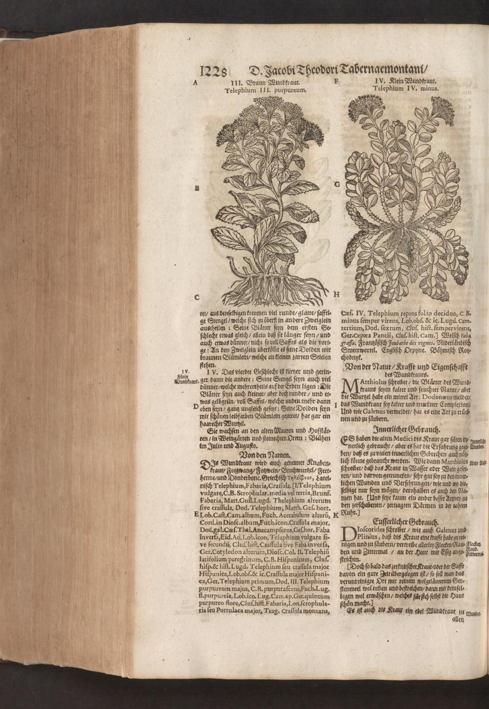 D. Jacobi Theodori Tabernaemontani, Neu vollkommen Kräuter-Buch : Darinnen Uber 3000. Kräuter/ mit schönen und kunstlichen Figuren/ auch deren Underscheid und Würckung/ samt ihren Namen in mancherley Sprachen/ beschrieben: Desgleichen auch/ wie dieselbige in allerhand Kranckheiten/ beyde der Menschen und des Viehs/ sollen angewendet und gebraucht werden/ angezeigt wird. Erstlichen durch Casparum Bauhinum D. und Profess. Basil. mit vielen neuen Figuren/ nutzlichen Artzneyen/ und anderem/ mit sonderem Fleis gebesseret/ Zum Andern Durch Hieronymum Bauhinum D. und Profess. Basil. mit sehr nutzlichen Marginalien, Synonimis, neuen Registeren und anderem vermehrt