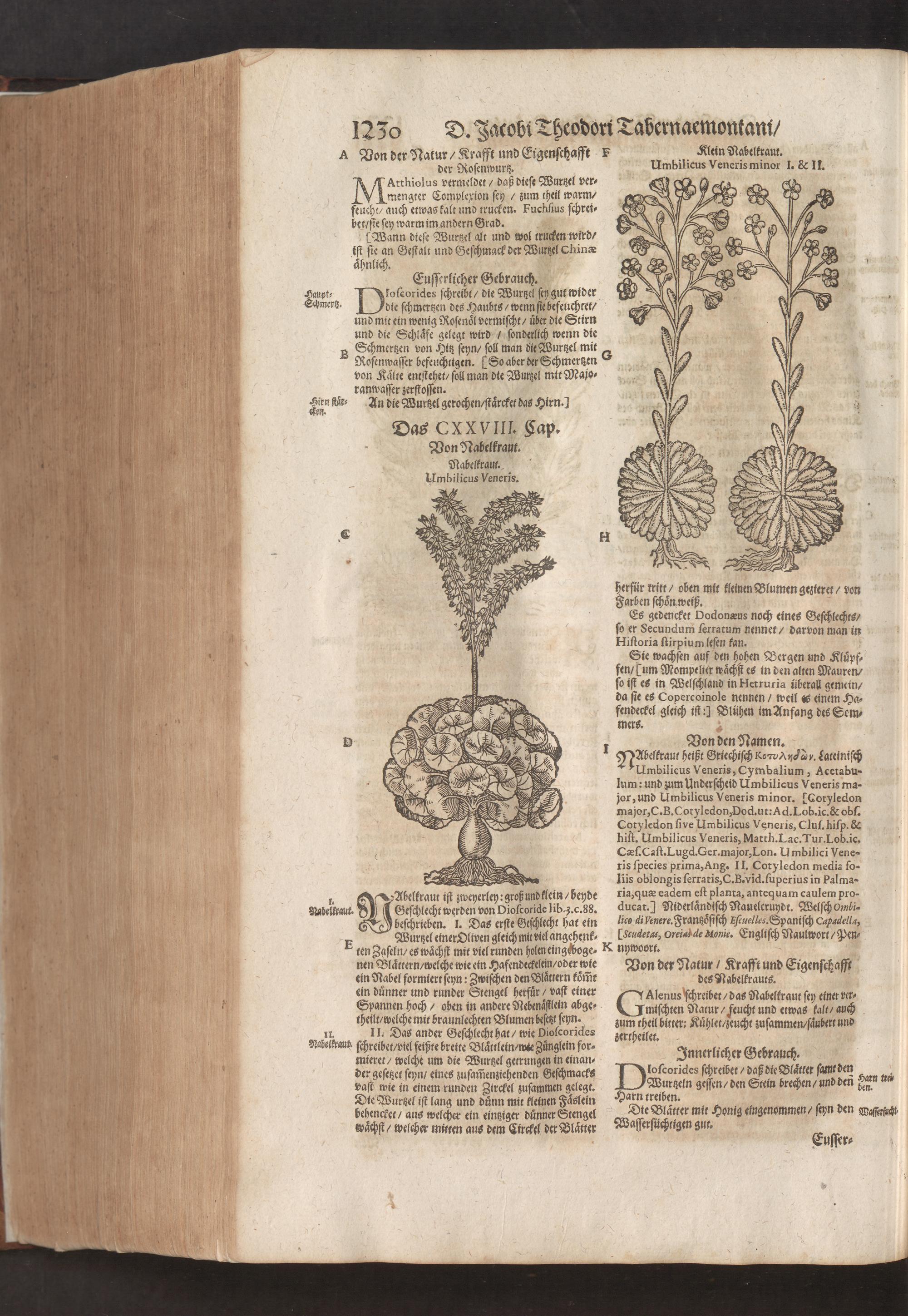 D. Jacobi Theodori Tabernaemontani, Neu vollkommen Kräuter-Buch : Darinnen Uber 3000. Kräuter/ mit schönen und kunstlichen Figuren/ auch deren Underscheid und Würckung/ samt ihren Namen in mancherley Sprachen/ beschrieben: Desgleichen auch/ wie dieselbige in allerhand Kranckheiten/ beyde der Menschen und des Viehs/ sollen angewendet und gebraucht werden/ angezeigt wird. Erstlichen durch Casparum Bauhinum D. und Profess. Basil. mit vielen neuen Figuren/ nutzlichen Artzneyen/ und anderem/ mit sonderem Fleis gebesseret/ Zum Andern Durch Hieronymum Bauhinum D. und Profess. Basil. mit sehr nutzlichen Marginalien, Synonimis, neuen Registeren und anderem vermehrt