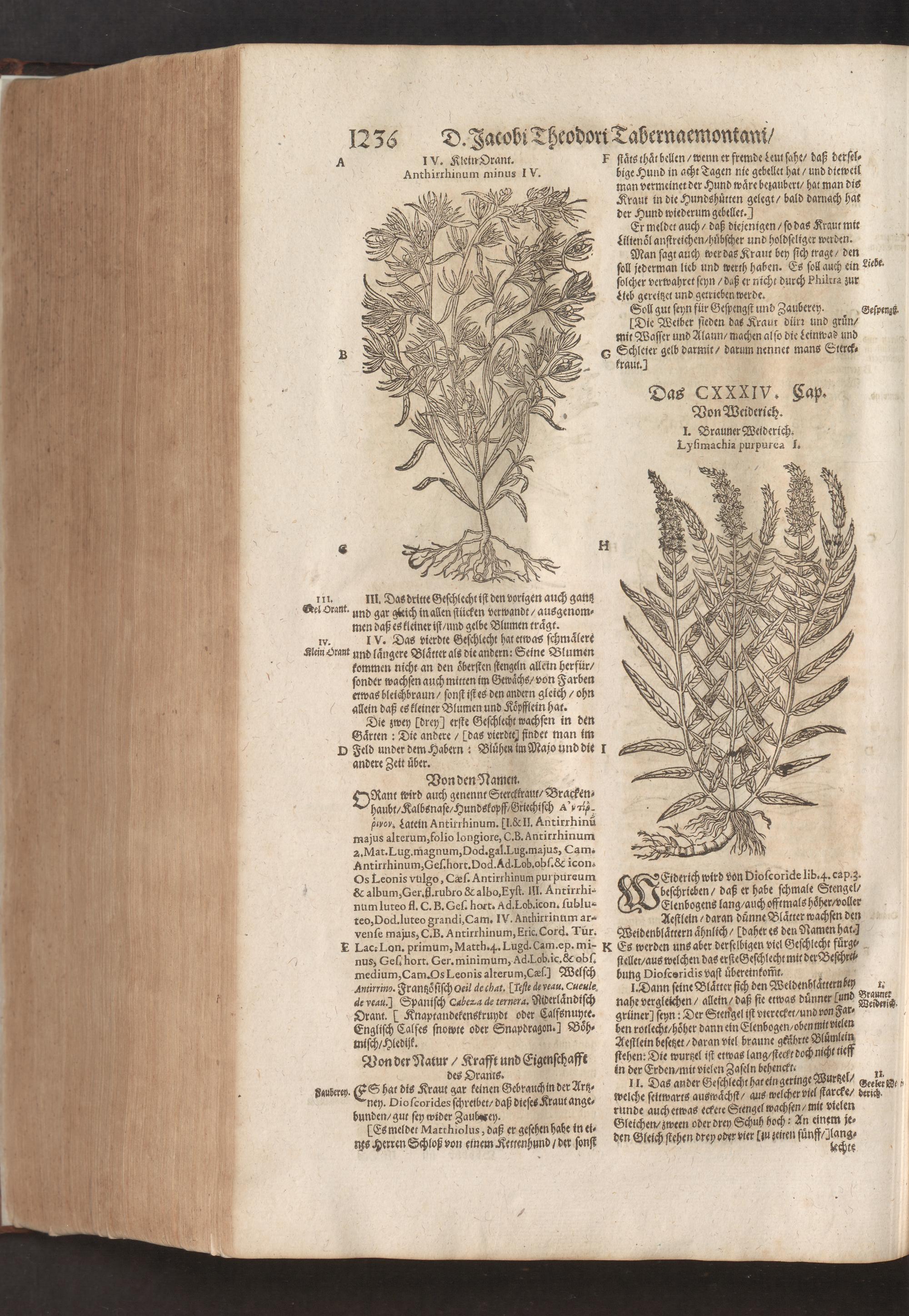 D. Jacobi Theodori Tabernaemontani, Neu vollkommen Kräuter-Buch : Darinnen Uber 3000. Kräuter/ mit schönen und kunstlichen Figuren/ auch deren Underscheid und Würckung/ samt ihren Namen in mancherley Sprachen/ beschrieben: Desgleichen auch/ wie dieselbige in allerhand Kranckheiten/ beyde der Menschen und des Viehs/ sollen angewendet und gebraucht werden/ angezeigt wird. Erstlichen durch Casparum Bauhinum D. und Profess. Basil. mit vielen neuen Figuren/ nutzlichen Artzneyen/ und anderem/ mit sonderem Fleis gebesseret/ Zum Andern Durch Hieronymum Bauhinum D. und Profess. Basil. mit sehr nutzlichen Marginalien, Synonimis, neuen Registeren und anderem vermehrt