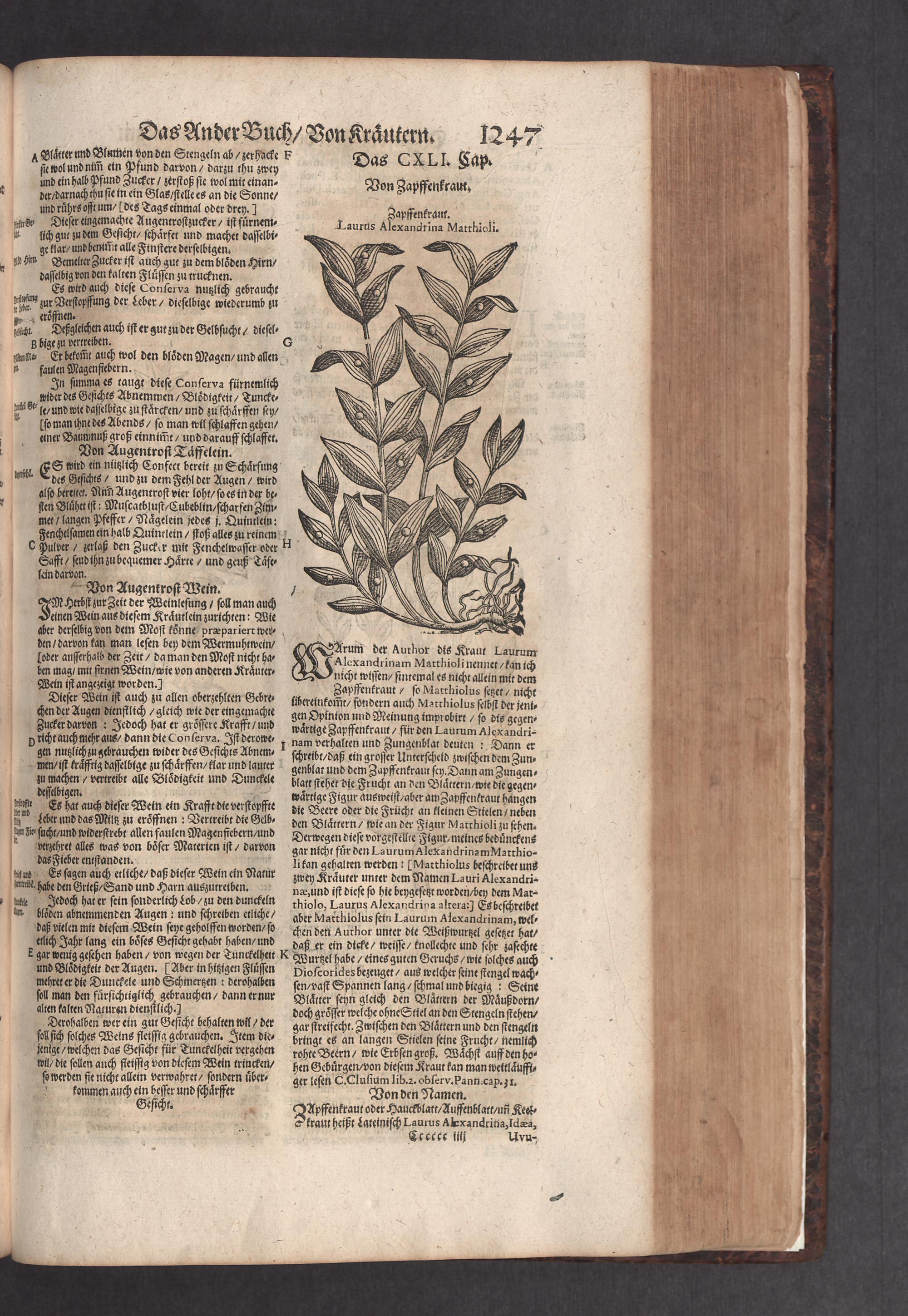 D. Jacobi Theodori Tabernaemontani, Neu vollkommen Kräuter-Buch : Darinnen Uber 3000. Kräuter/ mit schönen und kunstlichen Figuren/ auch deren Underscheid und Würckung/ samt ihren Namen in mancherley Sprachen/ beschrieben: Desgleichen auch/ wie dieselbige in allerhand Kranckheiten/ beyde der Menschen und des Viehs/ sollen angewendet und gebraucht werden/ angezeigt wird. Erstlichen durch Casparum Bauhinum D. und Profess. Basil. mit vielen neuen Figuren/ nutzlichen Artzneyen/ und anderem/ mit sonderem Fleis gebesseret/ Zum Andern Durch Hieronymum Bauhinum D. und Profess. Basil. mit sehr nutzlichen Marginalien, Synonimis, neuen Registeren und anderem vermehrt