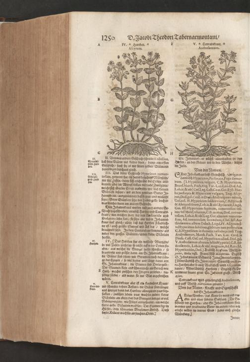 D. Jacobi Theodori Tabernaemontani, Neu vollkommen Kräuter-Buch : Darinnen Uber 3000. Kräuter/ mit schönen und kunstlichen Figuren/ auch deren Underscheid und Würckung/ samt ihren Namen in mancherley Sprachen/ beschrieben: Desgleichen auch/ wie dieselbige in allerhand Kranckheiten/ beyde der Menschen und des Viehs/ sollen angewendet und gebraucht werden/ angezeigt wird. Erstlichen durch Casparum Bauhinum D. und Profess. Basil. mit vielen neuen Figuren/ nutzlichen Artzneyen/ und anderem/ mit sonderem Fleis gebesseret/ Zum Andern Durch Hieronymum Bauhinum D. und Profess. Basil. mit sehr nutzlichen Marginalien, Synonimis, neuen Registeren und anderem vermehrt
