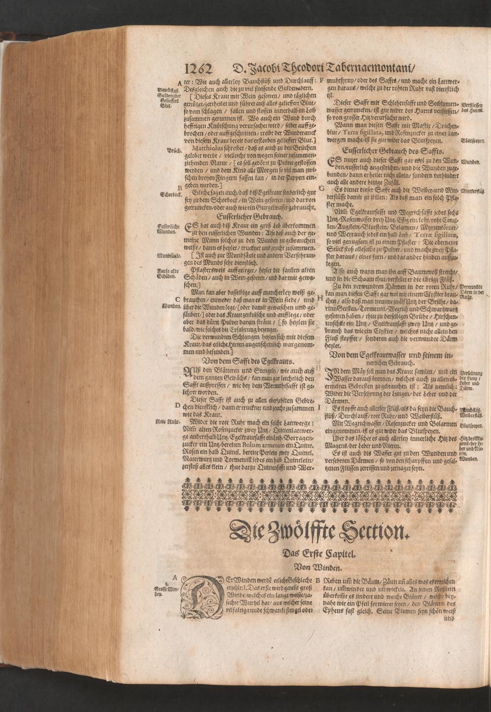 D. Jacobi Theodori Tabernaemontani, Neu vollkommen Kräuter-Buch : Darinnen Uber 3000. Kräuter/ mit schönen und kunstlichen Figuren/ auch deren Underscheid und Würckung/ samt ihren Namen in mancherley Sprachen/ beschrieben: Desgleichen auch/ wie dieselbige in allerhand Kranckheiten/ beyde der Menschen und des Viehs/ sollen angewendet und gebraucht werden/ angezeigt wird. Erstlichen durch Casparum Bauhinum D. und Profess. Basil. mit vielen neuen Figuren/ nutzlichen Artzneyen/ und anderem/ mit sonderem Fleis gebesseret/ Zum Andern Durch Hieronymum Bauhinum D. und Profess. Basil. mit sehr nutzlichen Marginalien, Synonimis, neuen Registeren und anderem vermehrt