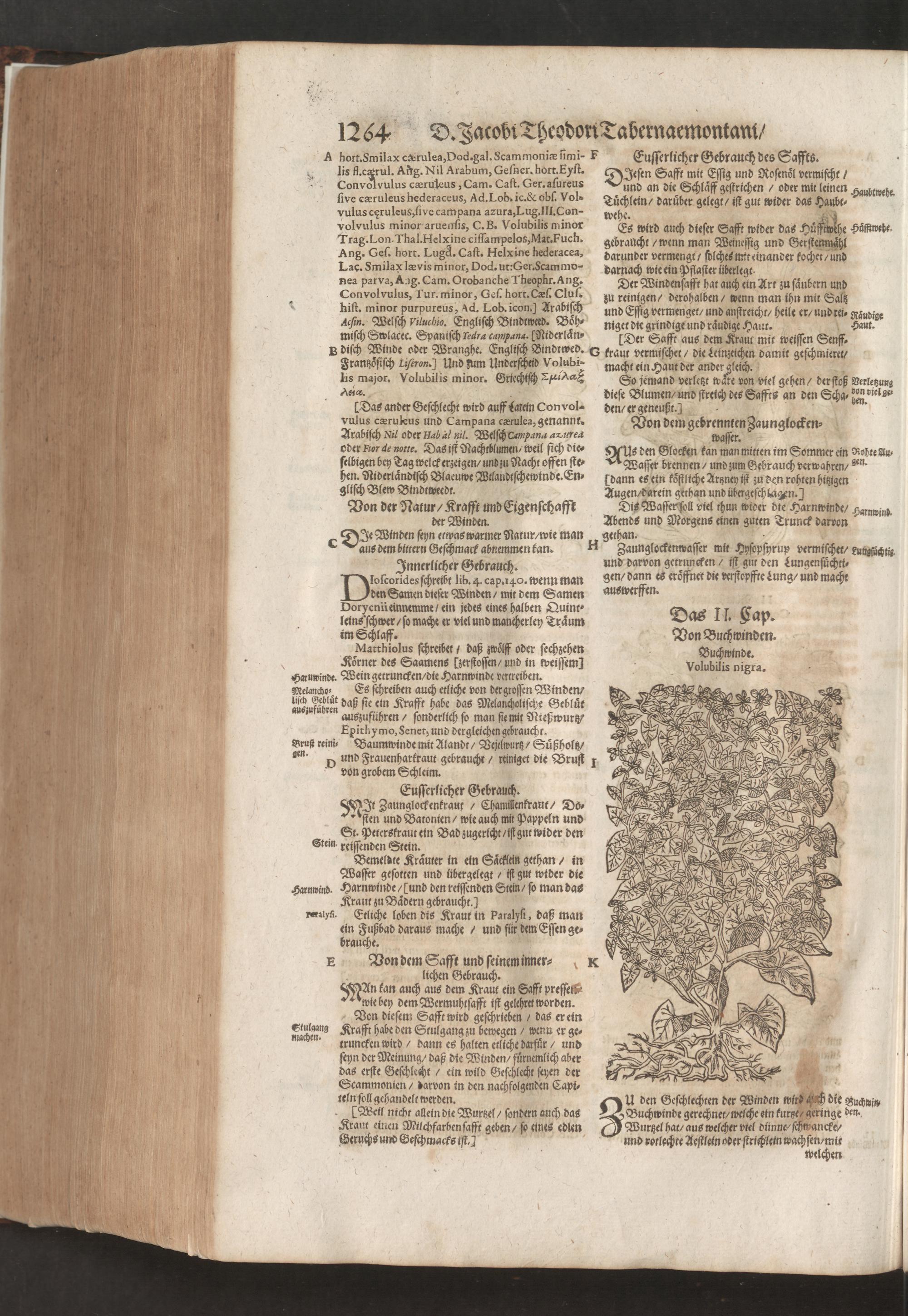 D. Jacobi Theodori Tabernaemontani, Neu vollkommen Kräuter-Buch : Darinnen Uber 3000. Kräuter/ mit schönen und kunstlichen Figuren/ auch deren Underscheid und Würckung/ samt ihren Namen in mancherley Sprachen/ beschrieben: Desgleichen auch/ wie dieselbige in allerhand Kranckheiten/ beyde der Menschen und des Viehs/ sollen angewendet und gebraucht werden/ angezeigt wird. Erstlichen durch Casparum Bauhinum D. und Profess. Basil. mit vielen neuen Figuren/ nutzlichen Artzneyen/ und anderem/ mit sonderem Fleis gebesseret/ Zum Andern Durch Hieronymum Bauhinum D. und Profess. Basil. mit sehr nutzlichen Marginalien, Synonimis, neuen Registeren und anderem vermehrt