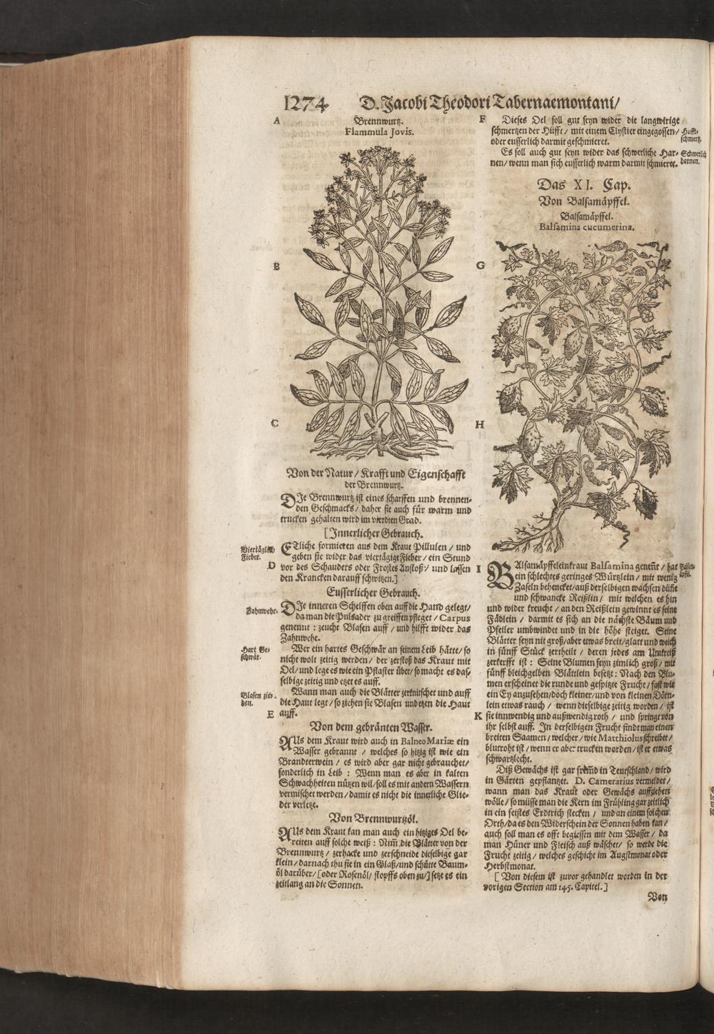 D. Jacobi Theodori Tabernaemontani, Neu vollkommen Kräuter-Buch : Darinnen Uber 3000. Kräuter/ mit schönen und kunstlichen Figuren/ auch deren Underscheid und Würckung/ samt ihren Namen in mancherley Sprachen/ beschrieben: Desgleichen auch/ wie dieselbige in allerhand Kranckheiten/ beyde der Menschen und des Viehs/ sollen angewendet und gebraucht werden/ angezeigt wird. Erstlichen durch Casparum Bauhinum D. und Profess. Basil. mit vielen neuen Figuren/ nutzlichen Artzneyen/ und anderem/ mit sonderem Fleis gebesseret/ Zum Andern Durch Hieronymum Bauhinum D. und Profess. Basil. mit sehr nutzlichen Marginalien, Synonimis, neuen Registeren und anderem vermehrt