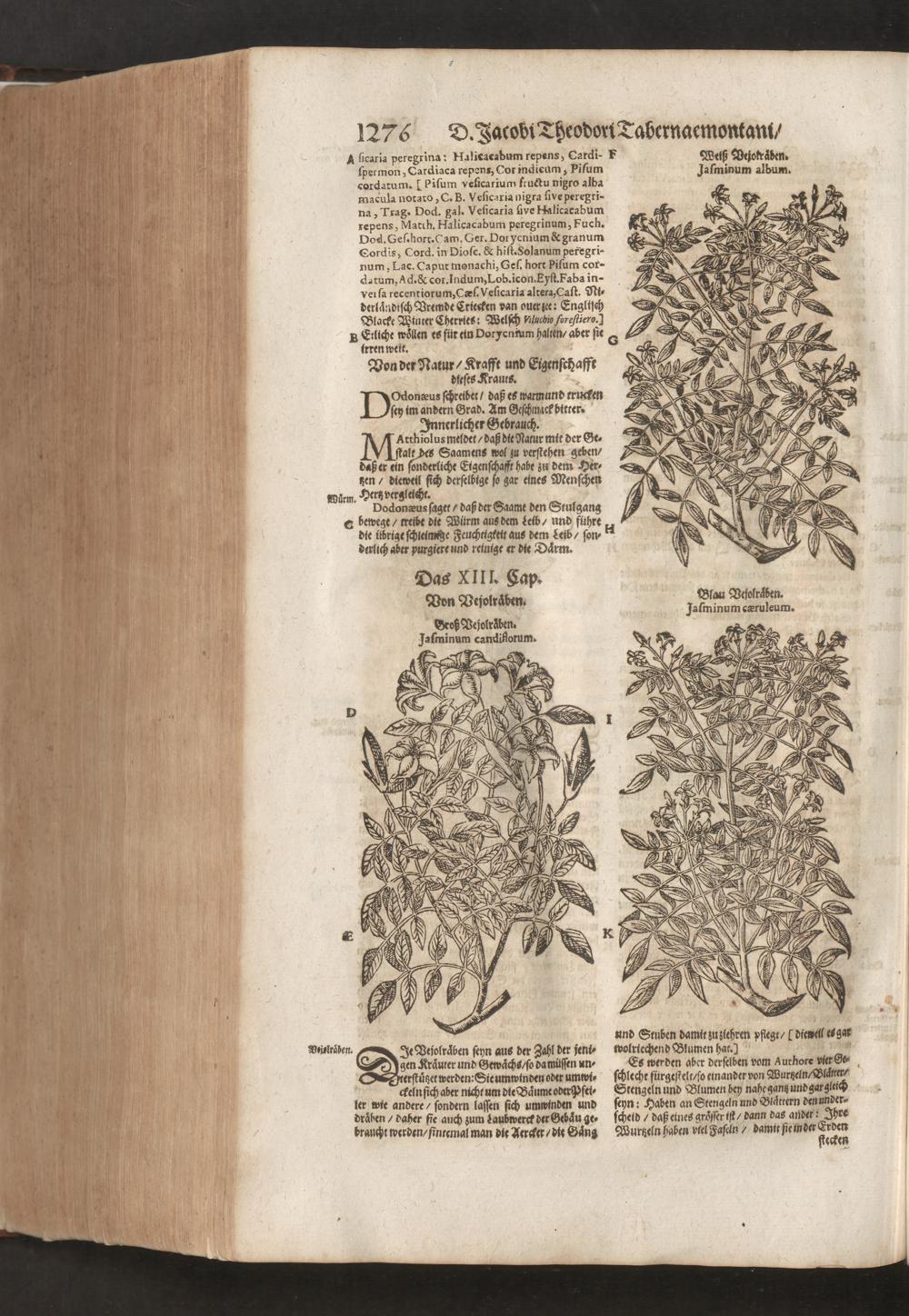 D. Jacobi Theodori Tabernaemontani, Neu vollkommen Kräuter-Buch : Darinnen Uber 3000. Kräuter/ mit schönen und kunstlichen Figuren/ auch deren Underscheid und Würckung/ samt ihren Namen in mancherley Sprachen/ beschrieben: Desgleichen auch/ wie dieselbige in allerhand Kranckheiten/ beyde der Menschen und des Viehs/ sollen angewendet und gebraucht werden/ angezeigt wird. Erstlichen durch Casparum Bauhinum D. und Profess. Basil. mit vielen neuen Figuren/ nutzlichen Artzneyen/ und anderem/ mit sonderem Fleis gebesseret/ Zum Andern Durch Hieronymum Bauhinum D. und Profess. Basil. mit sehr nutzlichen Marginalien, Synonimis, neuen Registeren und anderem vermehrt