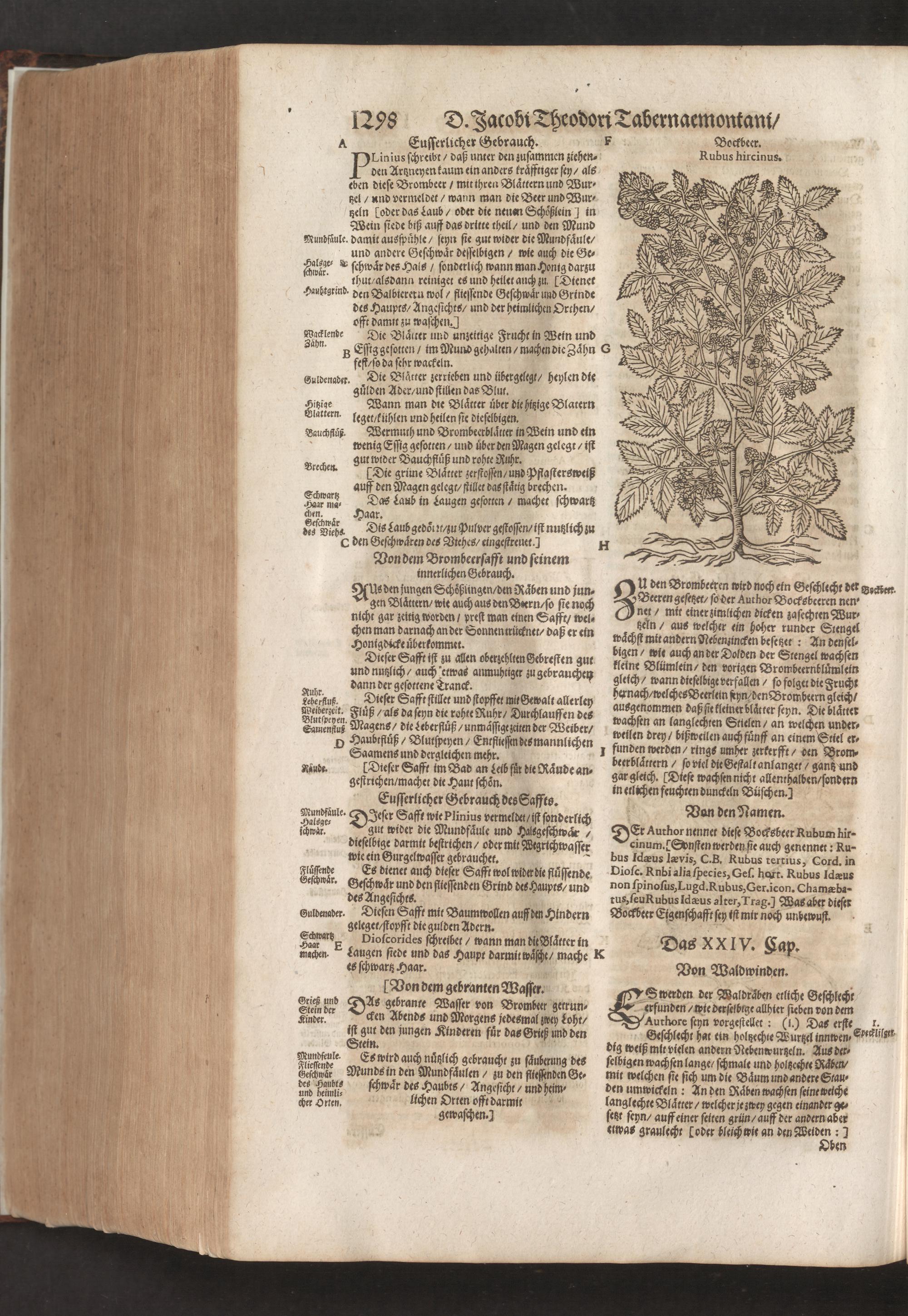 D. Jacobi Theodori Tabernaemontani, Neu vollkommen Kräuter-Buch : Darinnen Uber 3000. Kräuter/ mit schönen und kunstlichen Figuren/ auch deren Underscheid und Würckung/ samt ihren Namen in mancherley Sprachen/ beschrieben: Desgleichen auch/ wie dieselbige in allerhand Kranckheiten/ beyde der Menschen und des Viehs/ sollen angewendet und gebraucht werden/ angezeigt wird. Erstlichen durch Casparum Bauhinum D. und Profess. Basil. mit vielen neuen Figuren/ nutzlichen Artzneyen/ und anderem/ mit sonderem Fleis gebesseret/ Zum Andern Durch Hieronymum Bauhinum D. und Profess. Basil. mit sehr nutzlichen Marginalien, Synonimis, neuen Registeren und anderem vermehrt