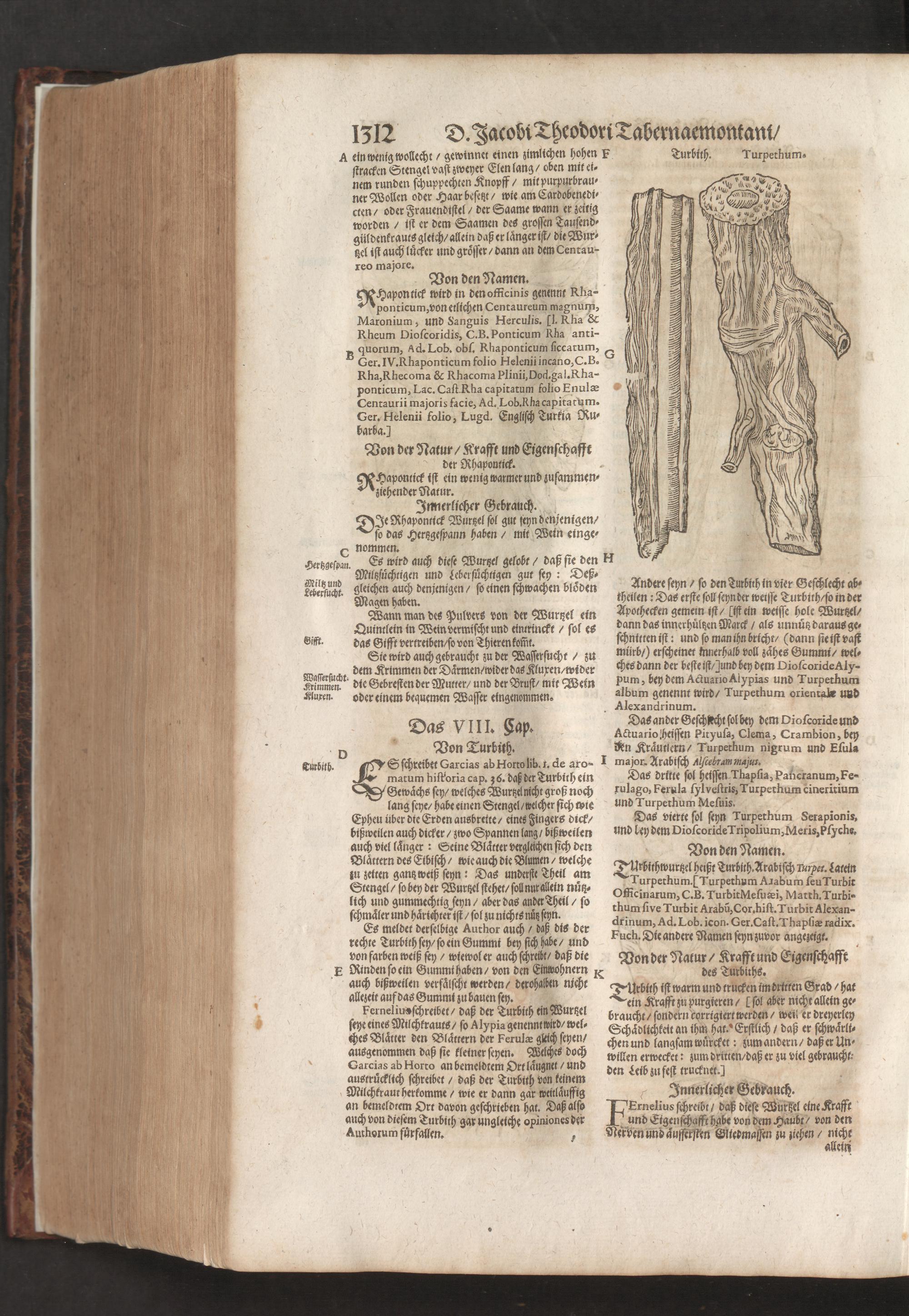 D. Jacobi Theodori Tabernaemontani, Neu vollkommen Kräuter-Buch : Darinnen Uber 3000. Kräuter/ mit schönen und kunstlichen Figuren/ auch deren Underscheid und Würckung/ samt ihren Namen in mancherley Sprachen/ beschrieben: Desgleichen auch/ wie dieselbige in allerhand Kranckheiten/ beyde der Menschen und des Viehs/ sollen angewendet und gebraucht werden/ angezeigt wird. Erstlichen durch Casparum Bauhinum D. und Profess. Basil. mit vielen neuen Figuren/ nutzlichen Artzneyen/ und anderem/ mit sonderem Fleis gebesseret/ Zum Andern Durch Hieronymum Bauhinum D. und Profess. Basil. mit sehr nutzlichen Marginalien, Synonimis, neuen Registeren und anderem vermehrt
