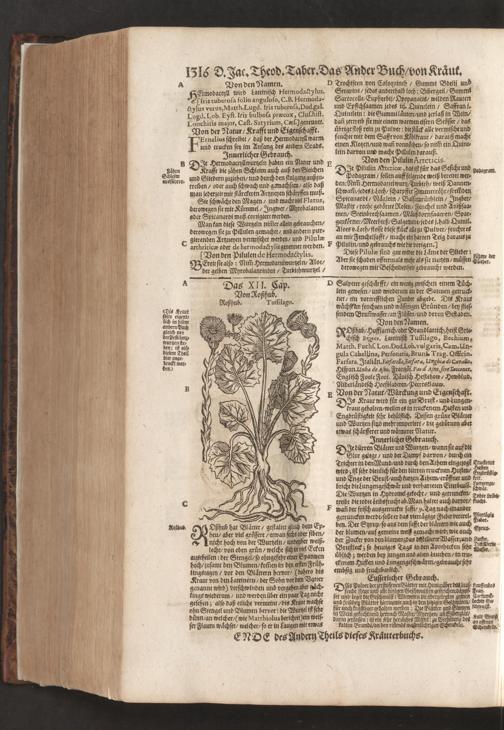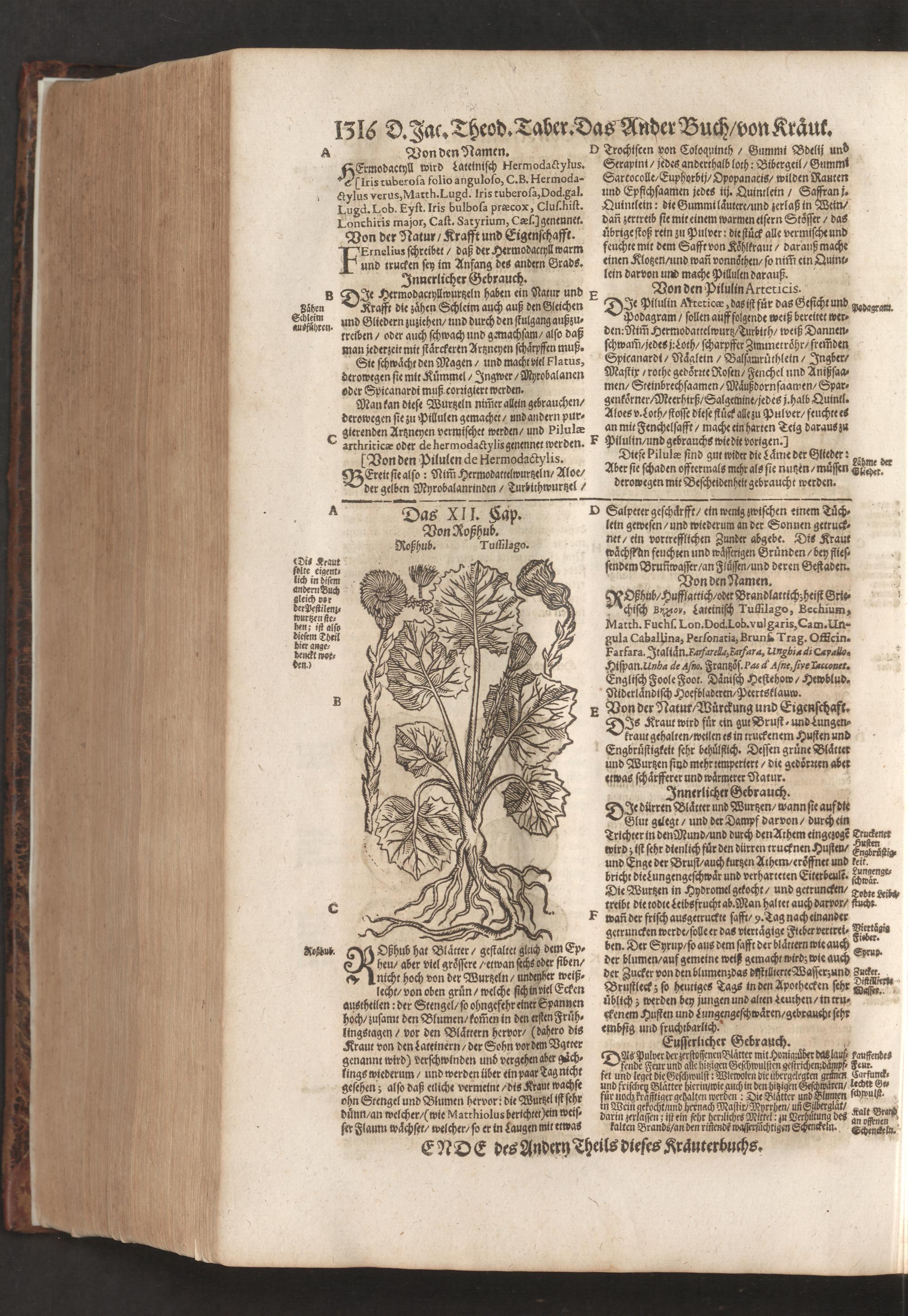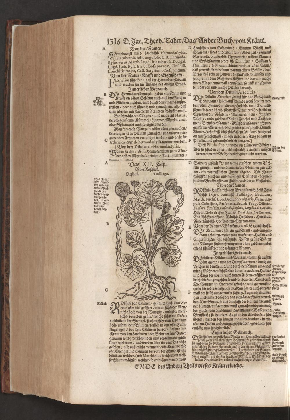 D. Jacobi Theodori Tabernaemontani, Neu vollkommen Kräuter-Buch : Darinnen Uber 3000. Kräuter/ mit schönen und kunstlichen Figuren/ auch deren Underscheid und Würckung/ samt ihren Namen in mancherley Sprachen/ beschrieben: Desgleichen auch/ wie dieselbige in allerhand Kranckheiten/ beyde der Menschen und des Viehs/ sollen angewendet und gebraucht werden/ angezeigt wird. Erstlichen durch Casparum Bauhinum D. und Profess. Basil. mit vielen neuen Figuren/ nutzlichen Artzneyen/ und anderem/ mit sonderem Fleis gebesseret/ Zum Andern Durch Hieronymum Bauhinum D. und Profess. Basil. mit sehr nutzlichen Marginalien, Synonimis, neuen Registeren und anderem vermehrt