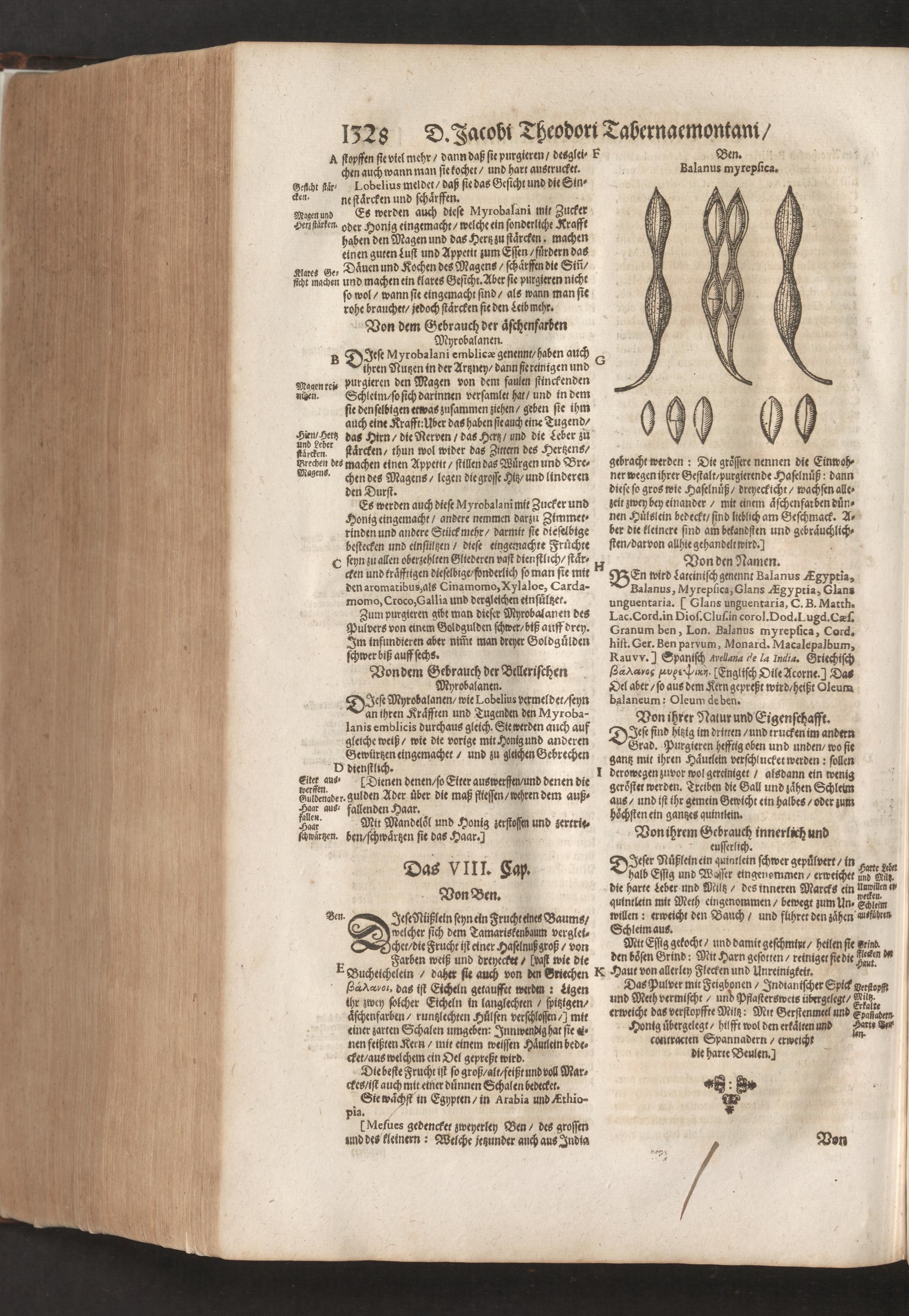 D. Jacobi Theodori Tabernaemontani, Neu vollkommen Kräuter-Buch : Darinnen Uber 3000. Kräuter/ mit schönen und kunstlichen Figuren/ auch deren Underscheid und Würckung/ samt ihren Namen in mancherley Sprachen/ beschrieben: Desgleichen auch/ wie dieselbige in allerhand Kranckheiten/ beyde der Menschen und des Viehs/ sollen angewendet und gebraucht werden/ angezeigt wird. Erstlichen durch Casparum Bauhinum D. und Profess. Basil. mit vielen neuen Figuren/ nutzlichen Artzneyen/ und anderem/ mit sonderem Fleis gebesseret/ Zum Andern Durch Hieronymum Bauhinum D. und Profess. Basil. mit sehr nutzlichen Marginalien, Synonimis, neuen Registeren und anderem vermehrt