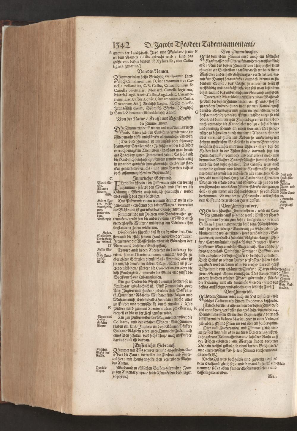 D. Jacobi Theodori Tabernaemontani, Neu vollkommen Kräuter-Buch : Darinnen Uber 3000. Kräuter/ mit schönen und kunstlichen Figuren/ auch deren Underscheid und Würckung/ samt ihren Namen in mancherley Sprachen/ beschrieben: Desgleichen auch/ wie dieselbige in allerhand Kranckheiten/ beyde der Menschen und des Viehs/ sollen angewendet und gebraucht werden/ angezeigt wird. Erstlichen durch Casparum Bauhinum D. und Profess. Basil. mit vielen neuen Figuren/ nutzlichen Artzneyen/ und anderem/ mit sonderem Fleis gebesseret/ Zum Andern Durch Hieronymum Bauhinum D. und Profess. Basil. mit sehr nutzlichen Marginalien, Synonimis, neuen Registeren und anderem vermehrt