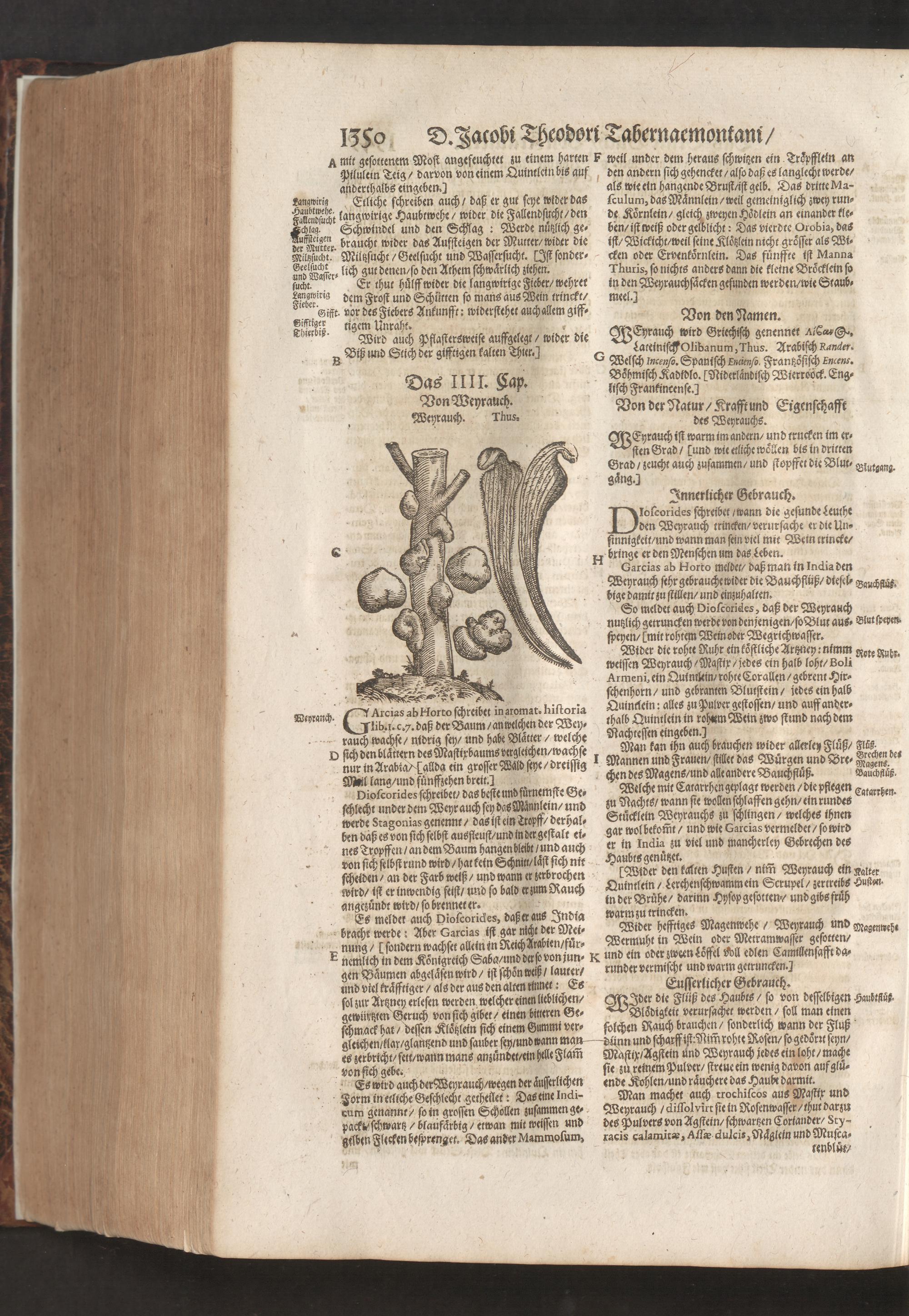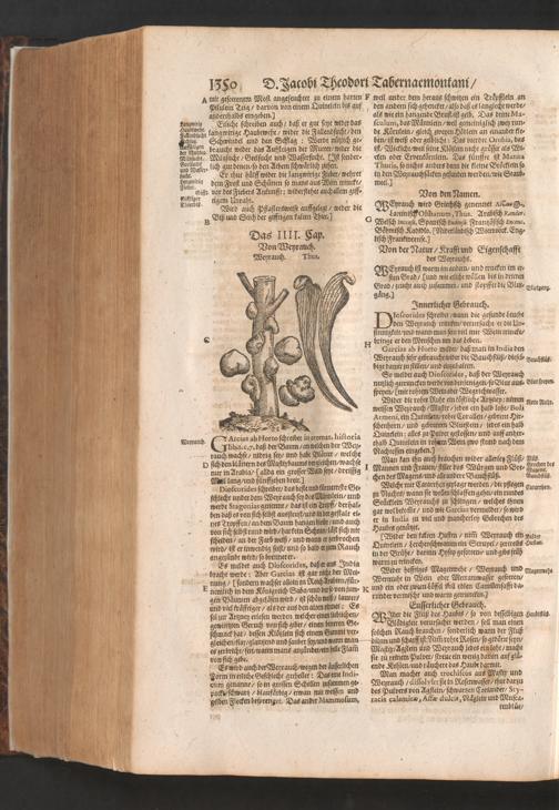 D. Jacobi Theodori Tabernaemontani, Neu vollkommen Kräuter-Buch : Darinnen Uber 3000. Kräuter/ mit schönen und kunstlichen Figuren/ auch deren Underscheid und Würckung/ samt ihren Namen in mancherley Sprachen/ beschrieben: Desgleichen auch/ wie dieselbige in allerhand Kranckheiten/ beyde der Menschen und des Viehs/ sollen angewendet und gebraucht werden/ angezeigt wird. Erstlichen durch Casparum Bauhinum D. und Profess. Basil. mit vielen neuen Figuren/ nutzlichen Artzneyen/ und anderem/ mit sonderem Fleis gebesseret/ Zum Andern Durch Hieronymum Bauhinum D. und Profess. Basil. mit sehr nutzlichen Marginalien, Synonimis, neuen Registeren und anderem vermehrt