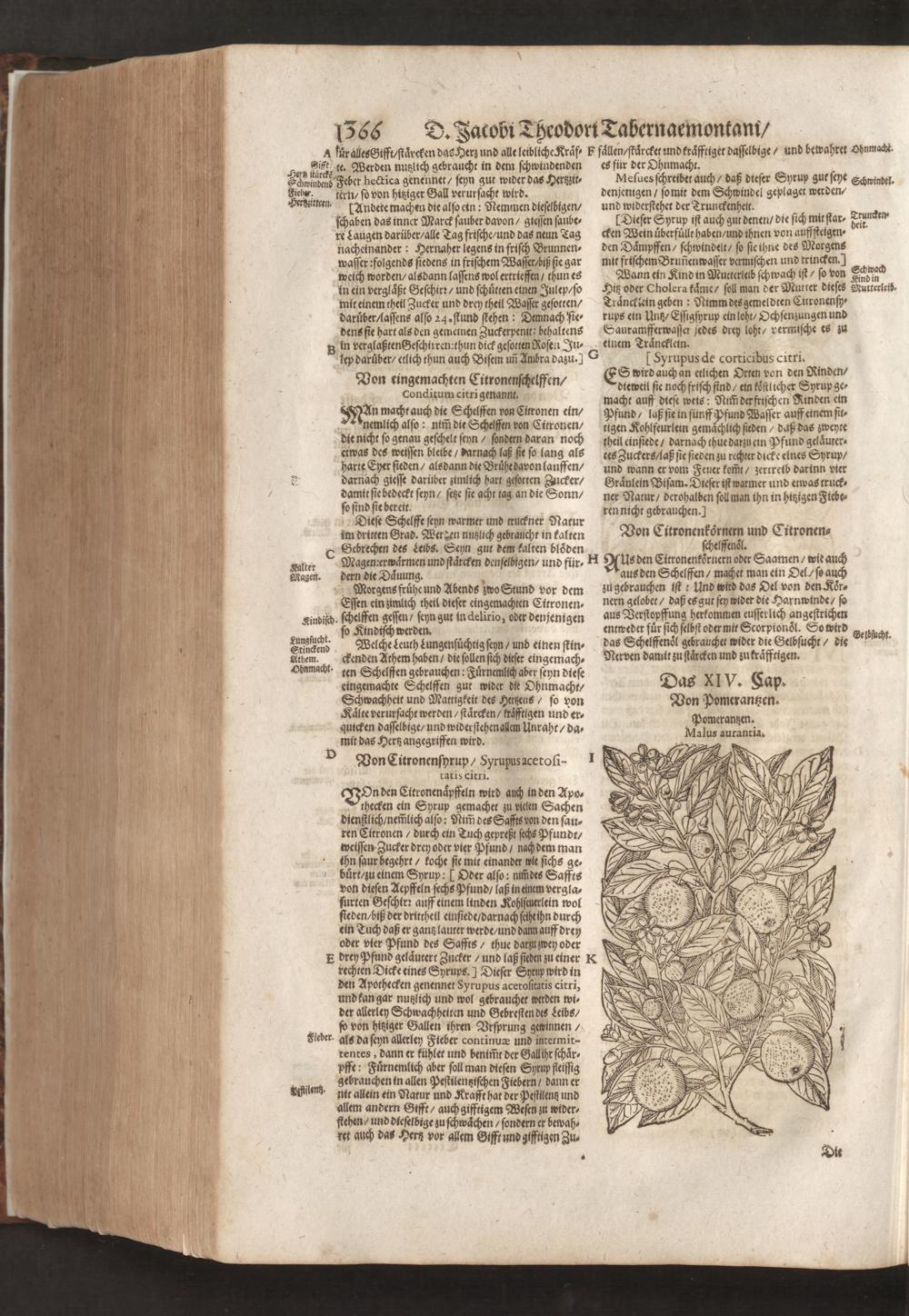 D. Jacobi Theodori Tabernaemontani, Neu vollkommen Kräuter-Buch : Darinnen Uber 3000. Kräuter/ mit schönen und kunstlichen Figuren/ auch deren Underscheid und Würckung/ samt ihren Namen in mancherley Sprachen/ beschrieben: Desgleichen auch/ wie dieselbige in allerhand Kranckheiten/ beyde der Menschen und des Viehs/ sollen angewendet und gebraucht werden/ angezeigt wird. Erstlichen durch Casparum Bauhinum D. und Profess. Basil. mit vielen neuen Figuren/ nutzlichen Artzneyen/ und anderem/ mit sonderem Fleis gebesseret/ Zum Andern Durch Hieronymum Bauhinum D. und Profess. Basil. mit sehr nutzlichen Marginalien, Synonimis, neuen Registeren und anderem vermehrt