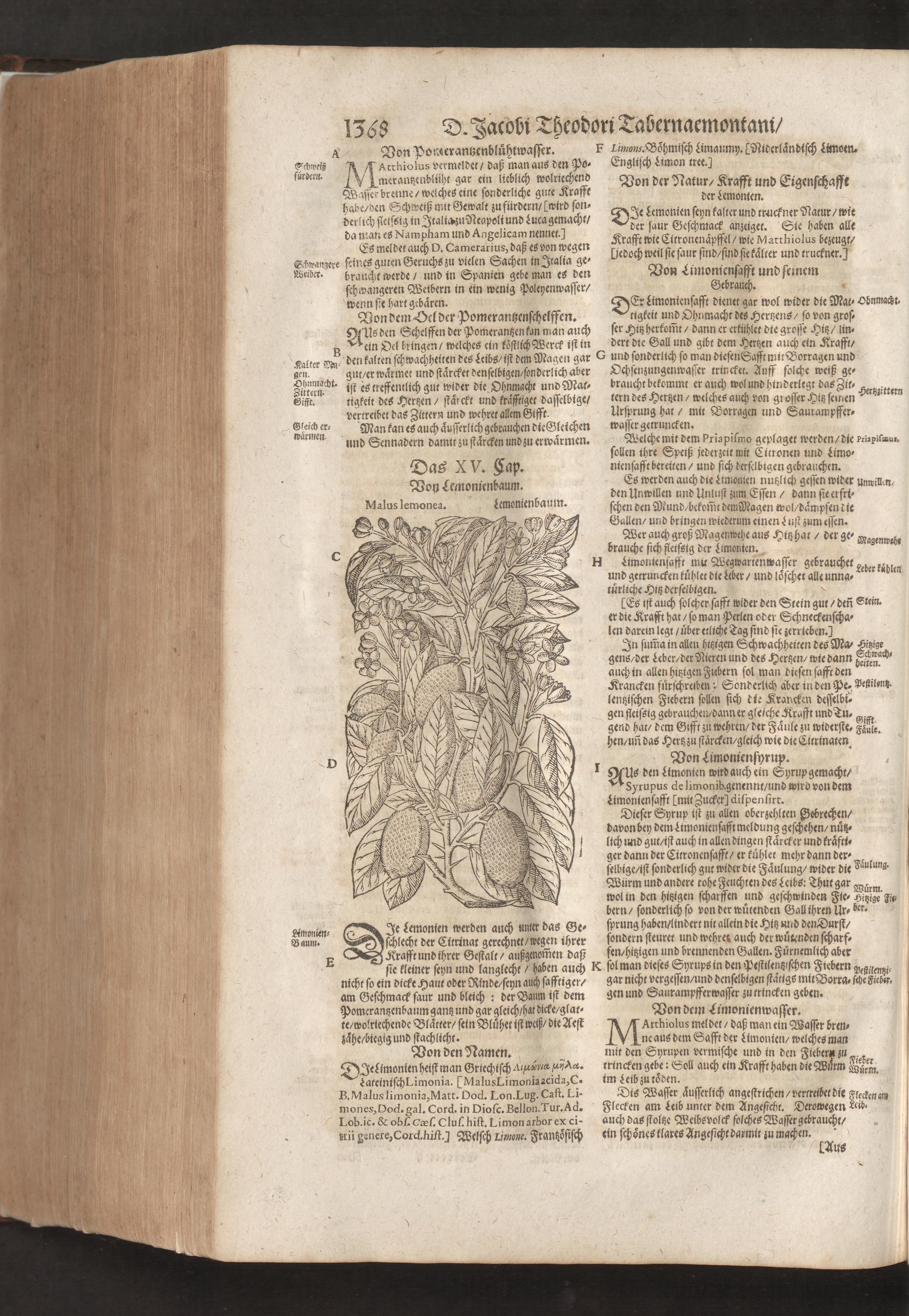 D. Jacobi Theodori Tabernaemontani, Neu vollkommen Kräuter-Buch : Darinnen Uber 3000. Kräuter/ mit schönen und kunstlichen Figuren/ auch deren Underscheid und Würckung/ samt ihren Namen in mancherley Sprachen/ beschrieben: Desgleichen auch/ wie dieselbige in allerhand Kranckheiten/ beyde der Menschen und des Viehs/ sollen angewendet und gebraucht werden/ angezeigt wird. Erstlichen durch Casparum Bauhinum D. und Profess. Basil. mit vielen neuen Figuren/ nutzlichen Artzneyen/ und anderem/ mit sonderem Fleis gebesseret/ Zum Andern Durch Hieronymum Bauhinum D. und Profess. Basil. mit sehr nutzlichen Marginalien, Synonimis, neuen Registeren und anderem vermehrt