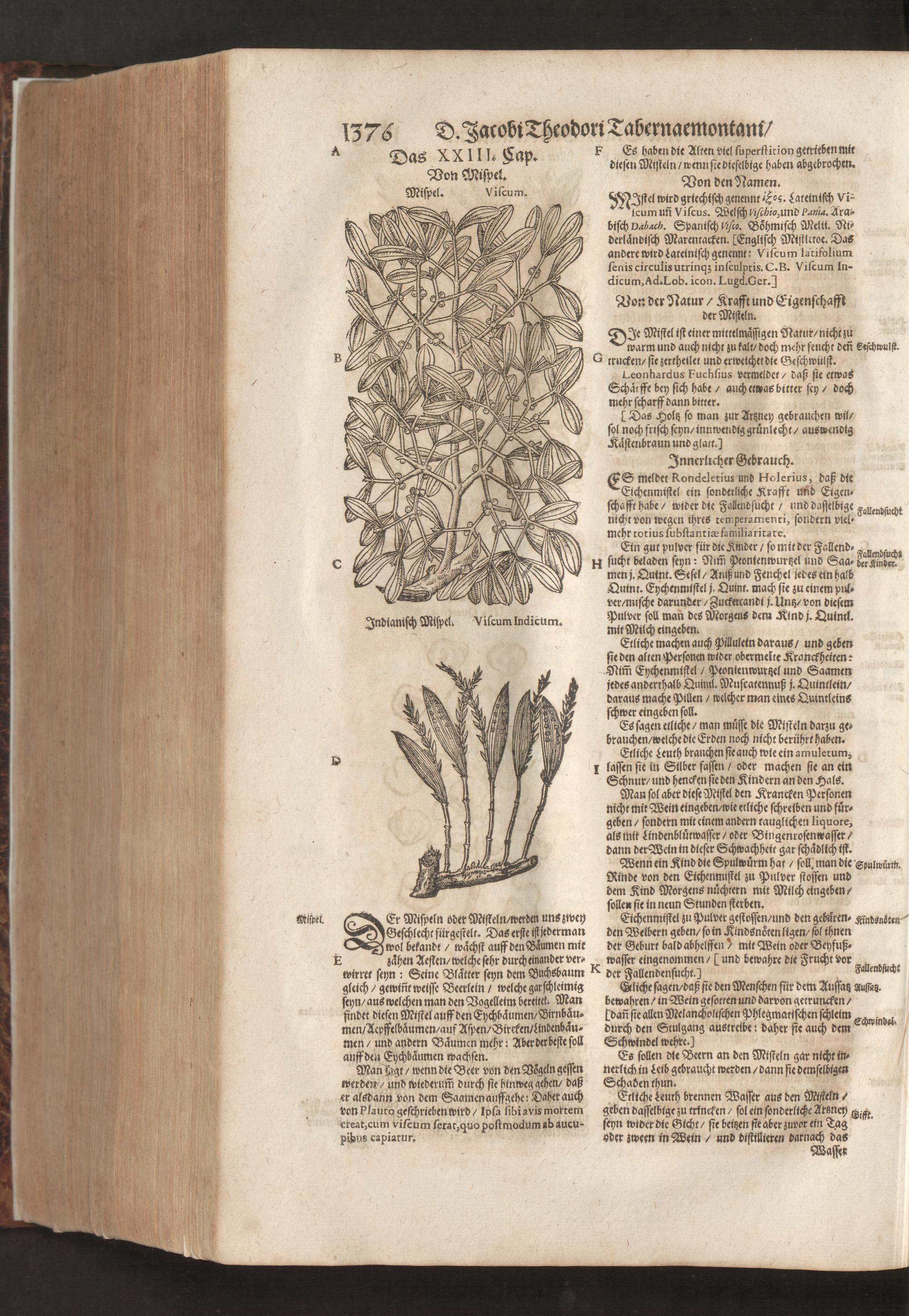 D. Jacobi Theodori Tabernaemontani, Neu vollkommen Kräuter-Buch : Darinnen Uber 3000. Kräuter/ mit schönen und kunstlichen Figuren/ auch deren Underscheid und Würckung/ samt ihren Namen in mancherley Sprachen/ beschrieben: Desgleichen auch/ wie dieselbige in allerhand Kranckheiten/ beyde der Menschen und des Viehs/ sollen angewendet und gebraucht werden/ angezeigt wird. Erstlichen durch Casparum Bauhinum D. und Profess. Basil. mit vielen neuen Figuren/ nutzlichen Artzneyen/ und anderem/ mit sonderem Fleis gebesseret/ Zum Andern Durch Hieronymum Bauhinum D. und Profess. Basil. mit sehr nutzlichen Marginalien, Synonimis, neuen Registeren und anderem vermehrt
