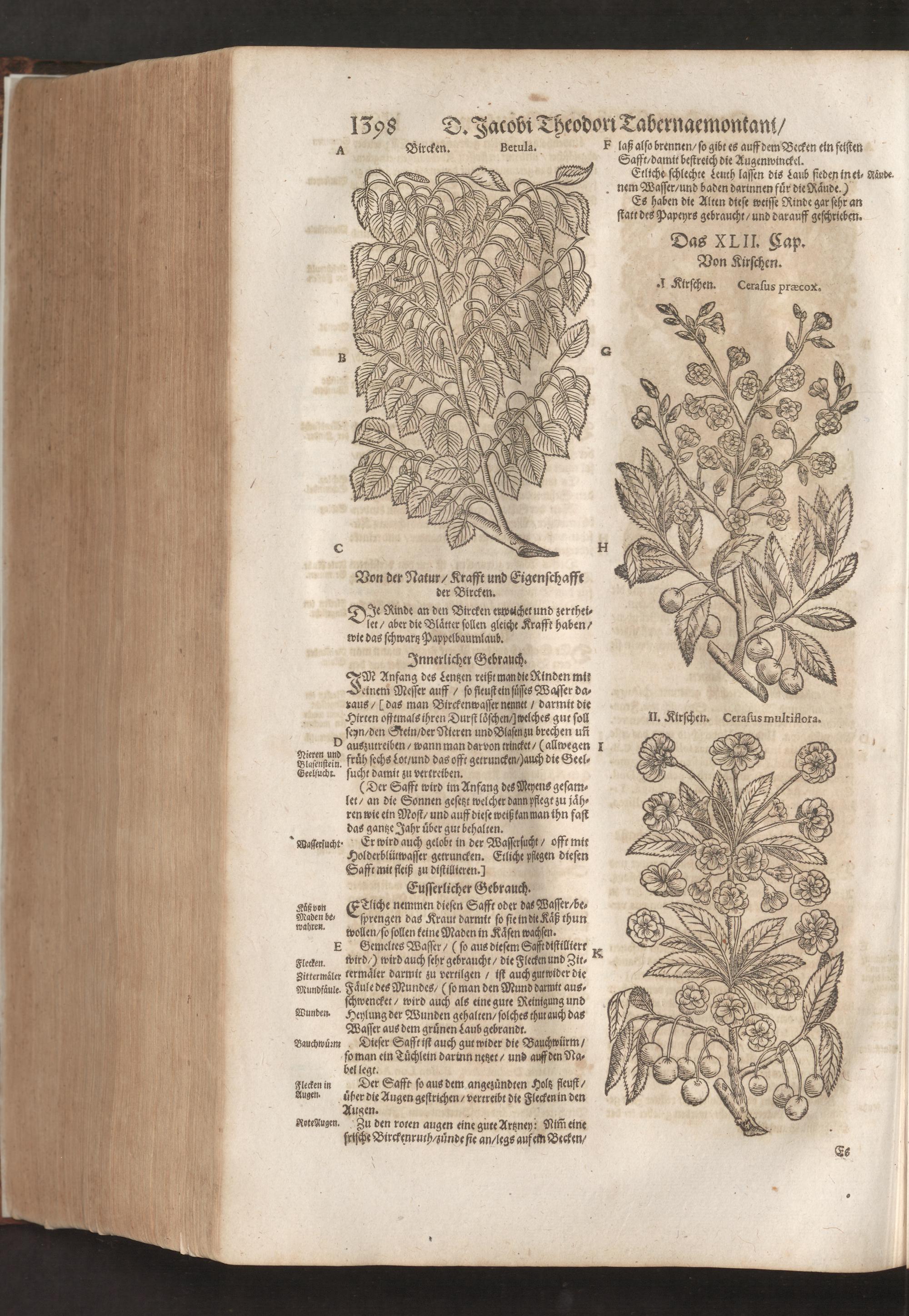 D. Jacobi Theodori Tabernaemontani, Neu vollkommen Kräuter-Buch : Darinnen Uber 3000. Kräuter/ mit schönen und kunstlichen Figuren/ auch deren Underscheid und Würckung/ samt ihren Namen in mancherley Sprachen/ beschrieben: Desgleichen auch/ wie dieselbige in allerhand Kranckheiten/ beyde der Menschen und des Viehs/ sollen angewendet und gebraucht werden/ angezeigt wird. Erstlichen durch Casparum Bauhinum D. und Profess. Basil. mit vielen neuen Figuren/ nutzlichen Artzneyen/ und anderem/ mit sonderem Fleis gebesseret/ Zum Andern Durch Hieronymum Bauhinum D. und Profess. Basil. mit sehr nutzlichen Marginalien, Synonimis, neuen Registeren und anderem vermehrt