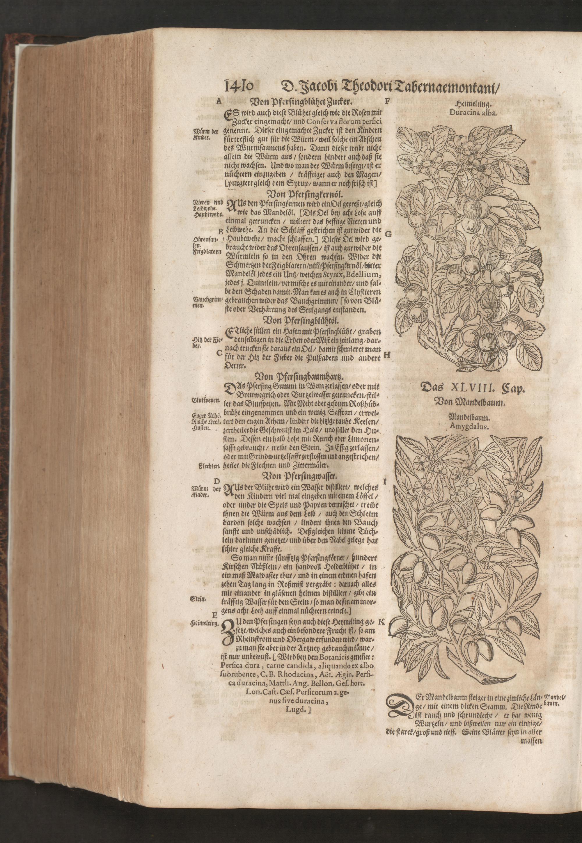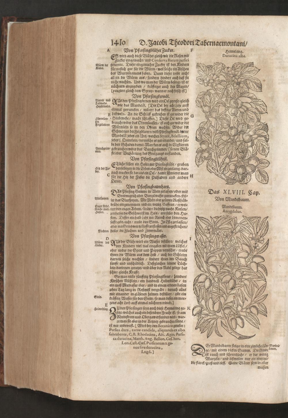 D. Jacobi Theodori Tabernaemontani, Neu vollkommen Kräuter-Buch : Darinnen Uber 3000. Kräuter/ mit schönen und kunstlichen Figuren/ auch deren Underscheid und Würckung/ samt ihren Namen in mancherley Sprachen/ beschrieben: Desgleichen auch/ wie dieselbige in allerhand Kranckheiten/ beyde der Menschen und des Viehs/ sollen angewendet und gebraucht werden/ angezeigt wird. Erstlichen durch Casparum Bauhinum D. und Profess. Basil. mit vielen neuen Figuren/ nutzlichen Artzneyen/ und anderem/ mit sonderem Fleis gebesseret/ Zum Andern Durch Hieronymum Bauhinum D. und Profess. Basil. mit sehr nutzlichen Marginalien, Synonimis, neuen Registeren und anderem vermehrt