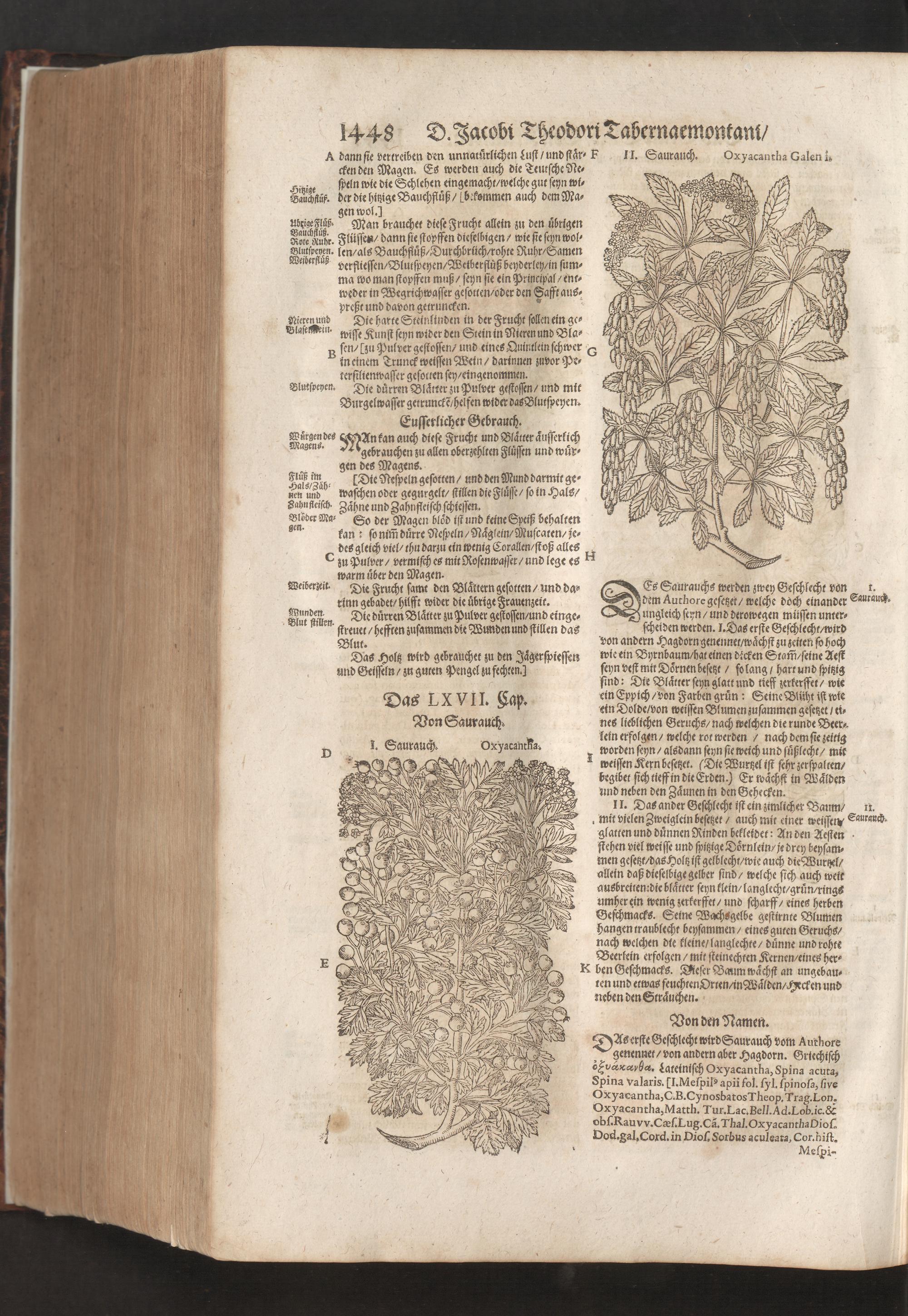 D. Jacobi Theodori Tabernaemontani, Neu vollkommen Kräuter-Buch : Darinnen Uber 3000. Kräuter/ mit schönen und kunstlichen Figuren/ auch deren Underscheid und Würckung/ samt ihren Namen in mancherley Sprachen/ beschrieben: Desgleichen auch/ wie dieselbige in allerhand Kranckheiten/ beyde der Menschen und des Viehs/ sollen angewendet und gebraucht werden/ angezeigt wird. Erstlichen durch Casparum Bauhinum D. und Profess. Basil. mit vielen neuen Figuren/ nutzlichen Artzneyen/ und anderem/ mit sonderem Fleis gebesseret/ Zum Andern Durch Hieronymum Bauhinum D. und Profess. Basil. mit sehr nutzlichen Marginalien, Synonimis, neuen Registeren und anderem vermehrt