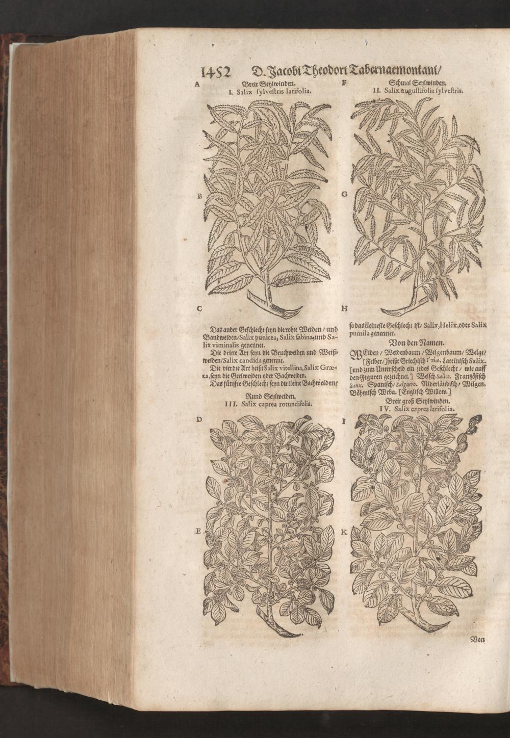 D. Jacobi Theodori Tabernaemontani, Neu vollkommen Kräuter-Buch : Darinnen Uber 3000. Kräuter/ mit schönen und kunstlichen Figuren/ auch deren Underscheid und Würckung/ samt ihren Namen in mancherley Sprachen/ beschrieben: Desgleichen auch/ wie dieselbige in allerhand Kranckheiten/ beyde der Menschen und des Viehs/ sollen angewendet und gebraucht werden/ angezeigt wird. Erstlichen durch Casparum Bauhinum D. und Profess. Basil. mit vielen neuen Figuren/ nutzlichen Artzneyen/ und anderem/ mit sonderem Fleis gebesseret/ Zum Andern Durch Hieronymum Bauhinum D. und Profess. Basil. mit sehr nutzlichen Marginalien, Synonimis, neuen Registeren und anderem vermehrt