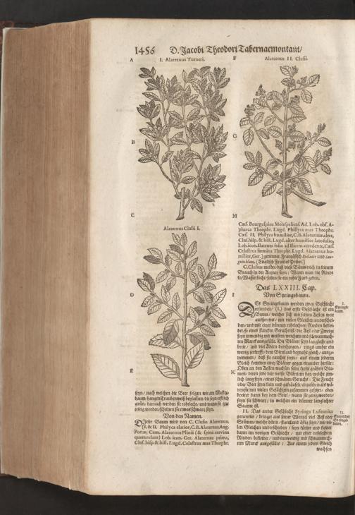 D. Jacobi Theodori Tabernaemontani, Neu vollkommen Kräuter-Buch : Darinnen Uber 3000. Kräuter/ mit schönen und kunstlichen Figuren/ auch deren Underscheid und Würckung/ samt ihren Namen in mancherley Sprachen/ beschrieben: Desgleichen auch/ wie dieselbige in allerhand Kranckheiten/ beyde der Menschen und des Viehs/ sollen angewendet und gebraucht werden/ angezeigt wird. Erstlichen durch Casparum Bauhinum D. und Profess. Basil. mit vielen neuen Figuren/ nutzlichen Artzneyen/ und anderem/ mit sonderem Fleis gebesseret/ Zum Andern Durch Hieronymum Bauhinum D. und Profess. Basil. mit sehr nutzlichen Marginalien, Synonimis, neuen Registeren und anderem vermehrt