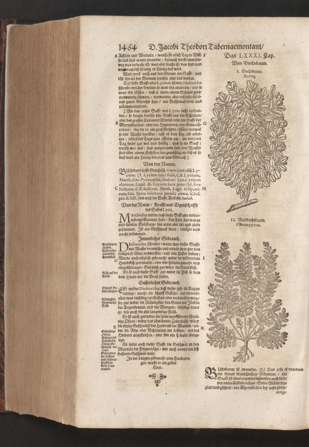 D. Jacobi Theodori Tabernaemontani, Neu vollkommen Kräuter-Buch : Darinnen Uber 3000. Kräuter/ mit schönen und kunstlichen Figuren/ auch deren Underscheid und Würckung/ samt ihren Namen in mancherley Sprachen/ beschrieben: Desgleichen auch/ wie dieselbige in allerhand Kranckheiten/ beyde der Menschen und des Viehs/ sollen angewendet und gebraucht werden/ angezeigt wird. Erstlichen durch Casparum Bauhinum D. und Profess. Basil. mit vielen neuen Figuren/ nutzlichen Artzneyen/ und anderem/ mit sonderem Fleis gebesseret/ Zum Andern Durch Hieronymum Bauhinum D. und Profess. Basil. mit sehr nutzlichen Marginalien, Synonimis, neuen Registeren und anderem vermehrt