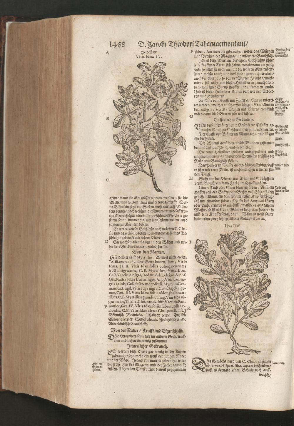 D. Jacobi Theodori Tabernaemontani, Neu vollkommen Kräuter-Buch : Darinnen Uber 3000. Kräuter/ mit schönen und kunstlichen Figuren/ auch deren Underscheid und Würckung/ samt ihren Namen in mancherley Sprachen/ beschrieben: Desgleichen auch/ wie dieselbige in allerhand Kranckheiten/ beyde der Menschen und des Viehs/ sollen angewendet und gebraucht werden/ angezeigt wird. Erstlichen durch Casparum Bauhinum D. und Profess. Basil. mit vielen neuen Figuren/ nutzlichen Artzneyen/ und anderem/ mit sonderem Fleis gebesseret/ Zum Andern Durch Hieronymum Bauhinum D. und Profess. Basil. mit sehr nutzlichen Marginalien, Synonimis, neuen Registeren und anderem vermehrt