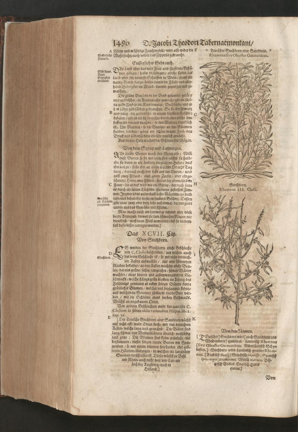 D. Jacobi Theodori Tabernaemontani, Neu vollkommen Kräuter-Buch : Darinnen Uber 3000. Kräuter/ mit schönen und kunstlichen Figuren/ auch deren Underscheid und Würckung/ samt ihren Namen in mancherley Sprachen/ beschrieben: Desgleichen auch/ wie dieselbige in allerhand Kranckheiten/ beyde der Menschen und des Viehs/ sollen angewendet und gebraucht werden/ angezeigt wird. Erstlichen durch Casparum Bauhinum D. und Profess. Basil. mit vielen neuen Figuren/ nutzlichen Artzneyen/ und anderem/ mit sonderem Fleis gebesseret/ Zum Andern Durch Hieronymum Bauhinum D. und Profess. Basil. mit sehr nutzlichen Marginalien, Synonimis, neuen Registeren und anderem vermehrt