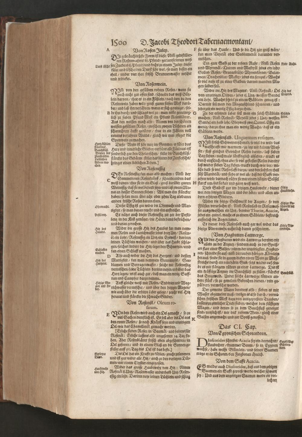 D. Jacobi Theodori Tabernaemontani, Neu vollkommen Kräuter-Buch : Darinnen Uber 3000. Kräuter/ mit schönen und kunstlichen Figuren/ auch deren Underscheid und Würckung/ samt ihren Namen in mancherley Sprachen/ beschrieben: Desgleichen auch/ wie dieselbige in allerhand Kranckheiten/ beyde der Menschen und des Viehs/ sollen angewendet und gebraucht werden/ angezeigt wird. Erstlichen durch Casparum Bauhinum D. und Profess. Basil. mit vielen neuen Figuren/ nutzlichen Artzneyen/ und anderem/ mit sonderem Fleis gebesseret/ Zum Andern Durch Hieronymum Bauhinum D. und Profess. Basil. mit sehr nutzlichen Marginalien, Synonimis, neuen Registeren und anderem vermehrt