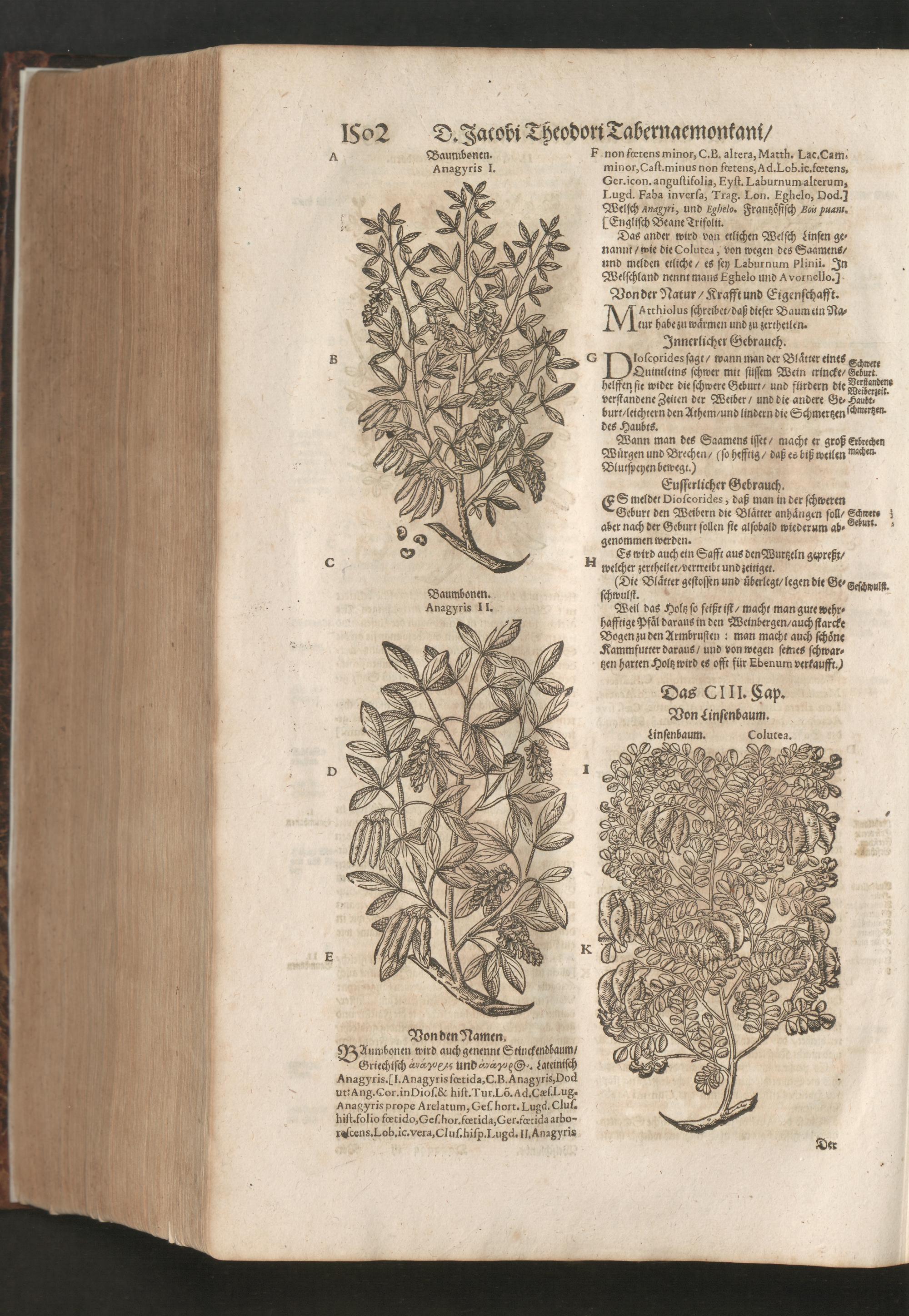 D. Jacobi Theodori Tabernaemontani, Neu vollkommen Kräuter-Buch : Darinnen Uber 3000. Kräuter/ mit schönen und kunstlichen Figuren/ auch deren Underscheid und Würckung/ samt ihren Namen in mancherley Sprachen/ beschrieben: Desgleichen auch/ wie dieselbige in allerhand Kranckheiten/ beyde der Menschen und des Viehs/ sollen angewendet und gebraucht werden/ angezeigt wird. Erstlichen durch Casparum Bauhinum D. und Profess. Basil. mit vielen neuen Figuren/ nutzlichen Artzneyen/ und anderem/ mit sonderem Fleis gebesseret/ Zum Andern Durch Hieronymum Bauhinum D. und Profess. Basil. mit sehr nutzlichen Marginalien, Synonimis, neuen Registeren und anderem vermehrt