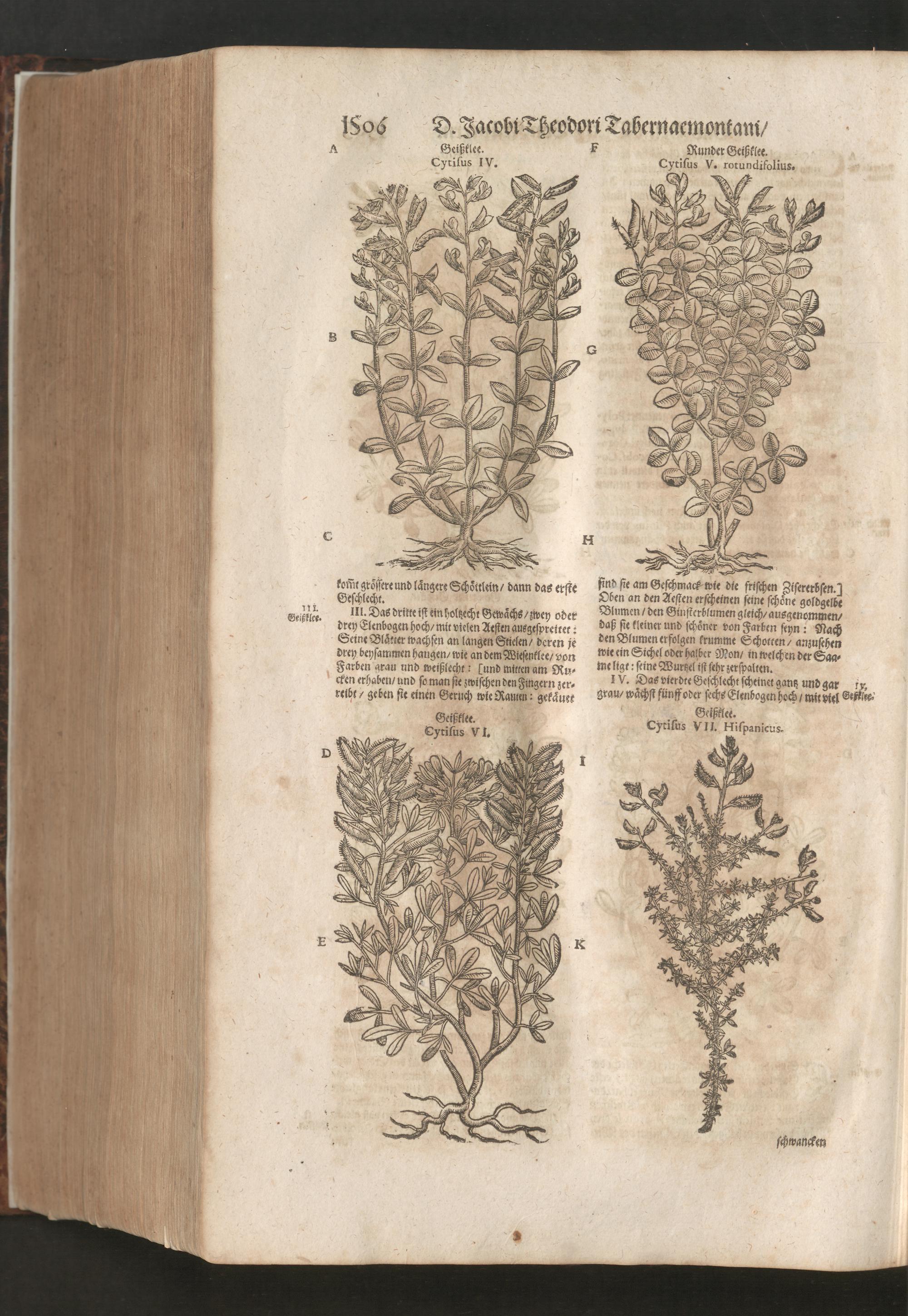 D. Jacobi Theodori Tabernaemontani, Neu vollkommen Kräuter-Buch : Darinnen Uber 3000. Kräuter/ mit schönen und kunstlichen Figuren/ auch deren Underscheid und Würckung/ samt ihren Namen in mancherley Sprachen/ beschrieben: Desgleichen auch/ wie dieselbige in allerhand Kranckheiten/ beyde der Menschen und des Viehs/ sollen angewendet und gebraucht werden/ angezeigt wird. Erstlichen durch Casparum Bauhinum D. und Profess. Basil. mit vielen neuen Figuren/ nutzlichen Artzneyen/ und anderem/ mit sonderem Fleis gebesseret/ Zum Andern Durch Hieronymum Bauhinum D. und Profess. Basil. mit sehr nutzlichen Marginalien, Synonimis, neuen Registeren und anderem vermehrt