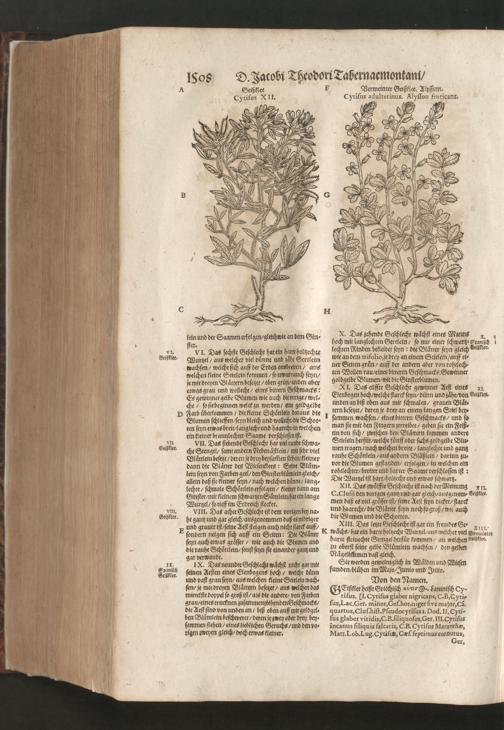 D. Jacobi Theodori Tabernaemontani, Neu vollkommen Kräuter-Buch : Darinnen Uber 3000. Kräuter/ mit schönen und kunstlichen Figuren/ auch deren Underscheid und Würckung/ samt ihren Namen in mancherley Sprachen/ beschrieben: Desgleichen auch/ wie dieselbige in allerhand Kranckheiten/ beyde der Menschen und des Viehs/ sollen angewendet und gebraucht werden/ angezeigt wird. Erstlichen durch Casparum Bauhinum D. und Profess. Basil. mit vielen neuen Figuren/ nutzlichen Artzneyen/ und anderem/ mit sonderem Fleis gebesseret/ Zum Andern Durch Hieronymum Bauhinum D. und Profess. Basil. mit sehr nutzlichen Marginalien, Synonimis, neuen Registeren und anderem vermehrt