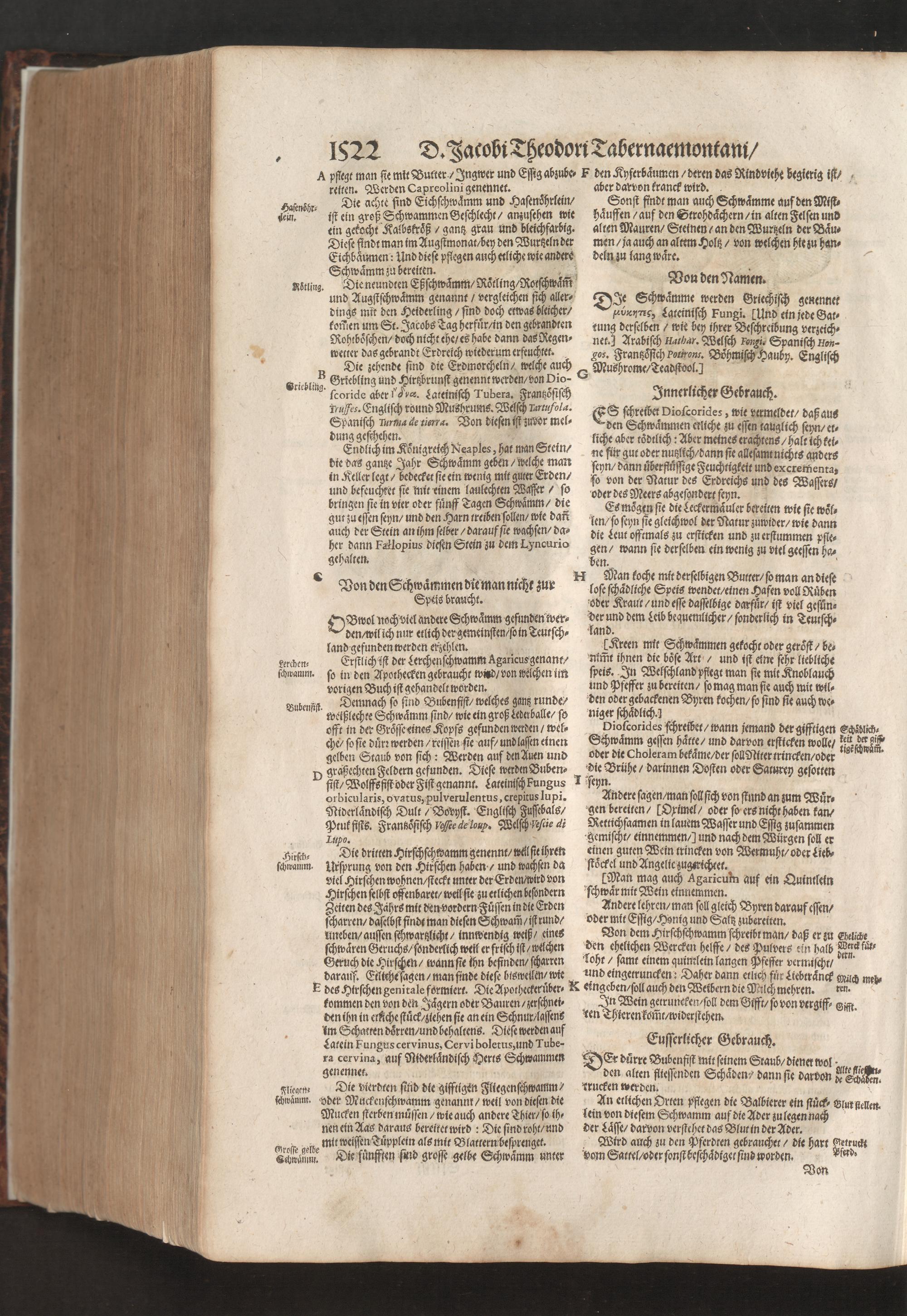 D. Jacobi Theodori Tabernaemontani, Neu vollkommen Kräuter-Buch : Darinnen Uber 3000. Kräuter/ mit schönen und kunstlichen Figuren/ auch deren Underscheid und Würckung/ samt ihren Namen in mancherley Sprachen/ beschrieben: Desgleichen auch/ wie dieselbige in allerhand Kranckheiten/ beyde der Menschen und des Viehs/ sollen angewendet und gebraucht werden/ angezeigt wird. Erstlichen durch Casparum Bauhinum D. und Profess. Basil. mit vielen neuen Figuren/ nutzlichen Artzneyen/ und anderem/ mit sonderem Fleis gebesseret/ Zum Andern Durch Hieronymum Bauhinum D. und Profess. Basil. mit sehr nutzlichen Marginalien, Synonimis, neuen Registeren und anderem vermehrt