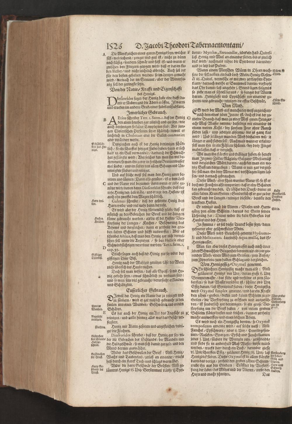 D. Jacobi Theodori Tabernaemontani, Neu vollkommen Kräuter-Buch : Darinnen Uber 3000. Kräuter/ mit schönen und kunstlichen Figuren/ auch deren Underscheid und Würckung/ samt ihren Namen in mancherley Sprachen/ beschrieben: Desgleichen auch/ wie dieselbige in allerhand Kranckheiten/ beyde der Menschen und des Viehs/ sollen angewendet und gebraucht werden/ angezeigt wird. Erstlichen durch Casparum Bauhinum D. und Profess. Basil. mit vielen neuen Figuren/ nutzlichen Artzneyen/ und anderem/ mit sonderem Fleis gebesseret/ Zum Andern Durch Hieronymum Bauhinum D. und Profess. Basil. mit sehr nutzlichen Marginalien, Synonimis, neuen Registeren und anderem vermehrt