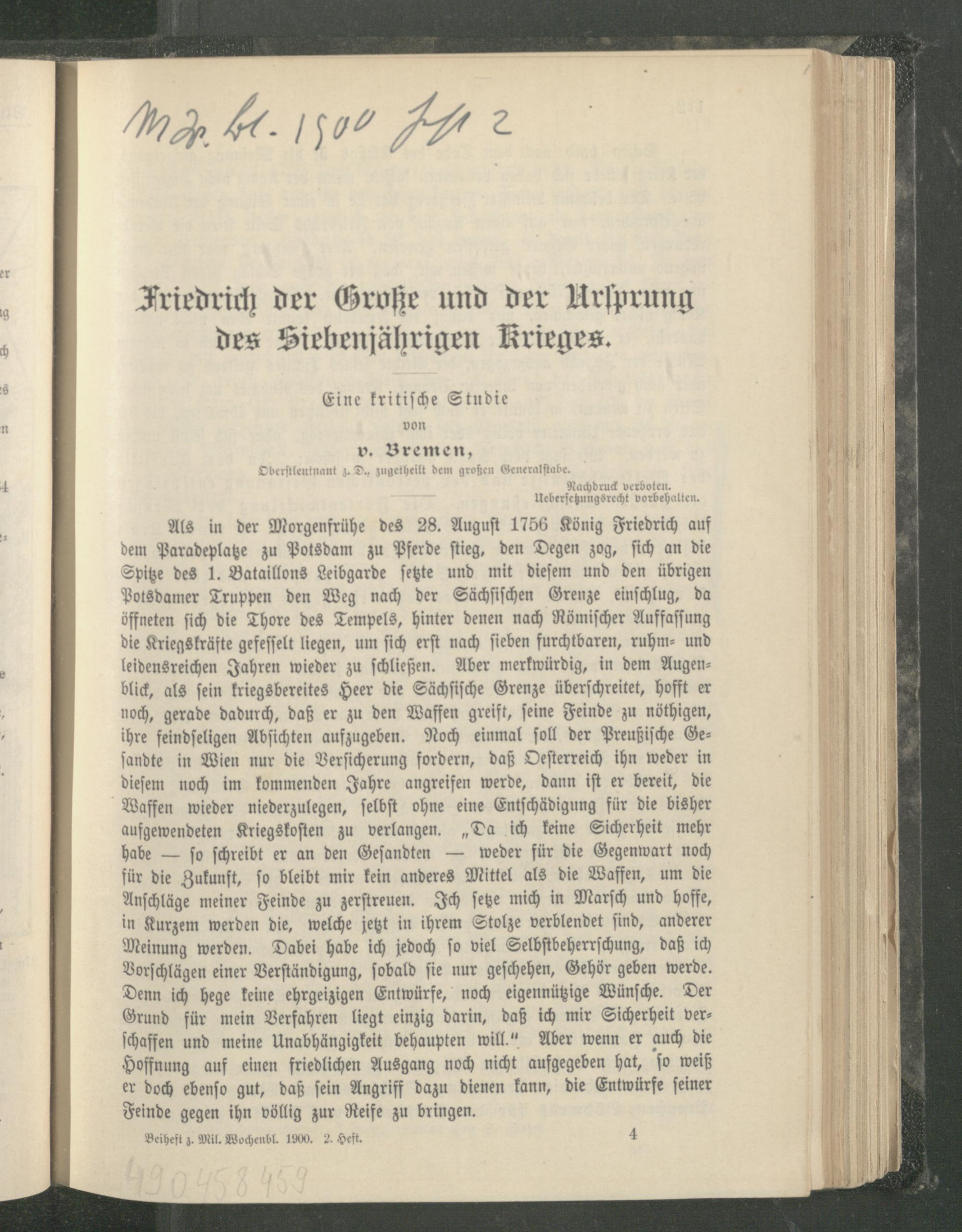Friedrich der Große und der Ursprung des Siebenjährigen Krieges : eine kritische Studie / von v. Bremen