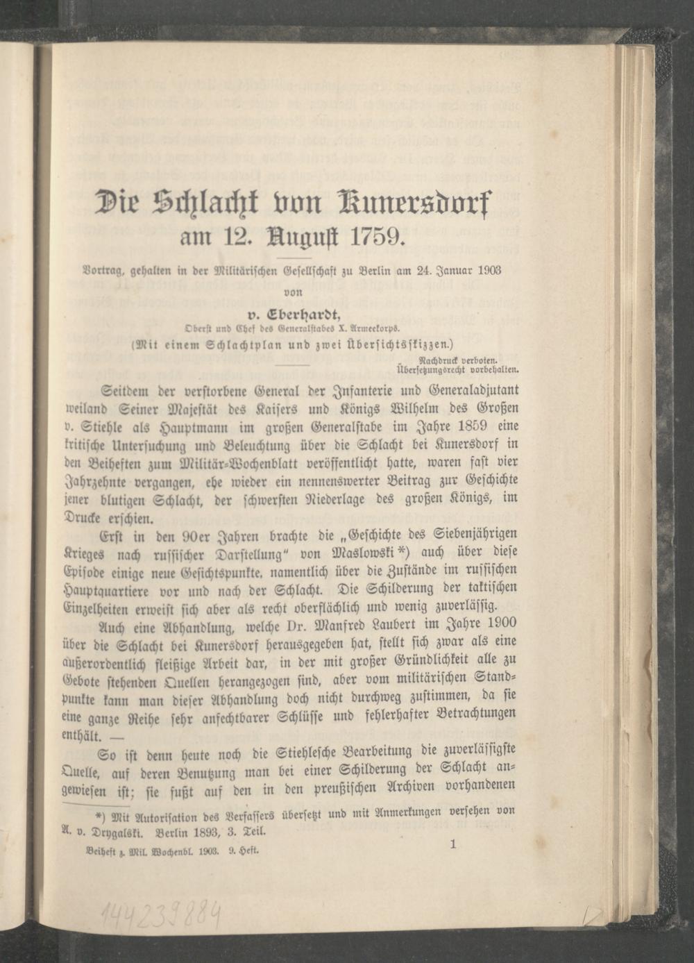 Die Schlacht von Kunersdorf am 12. August 1759 : Vortrag, gehalten in der Militärischen Gesellschaft zu Berlin am 25. Januar 1903 / von v. Eberhardt