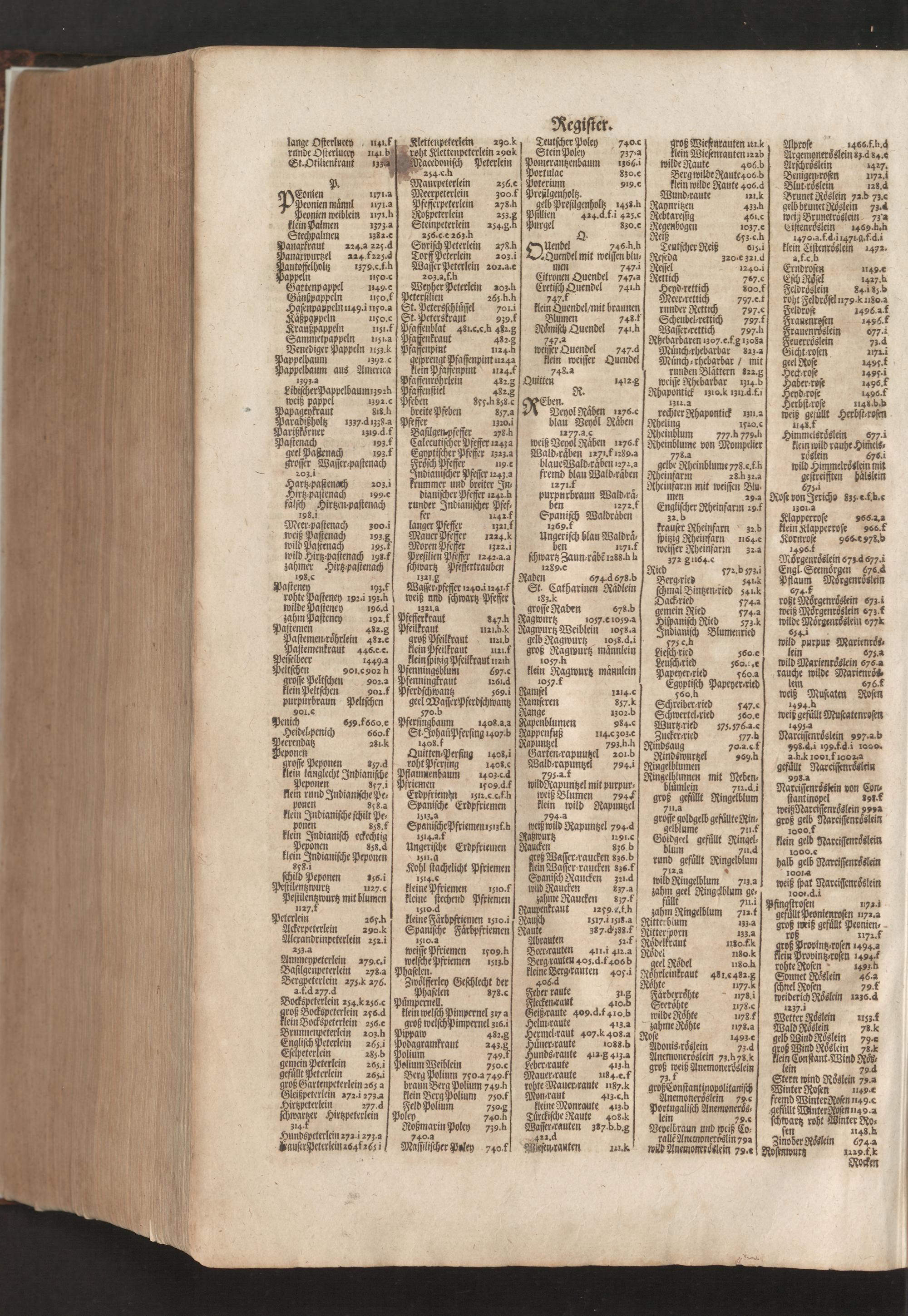 D. Jacobi Theodori Tabernaemontani, Neu vollkommen Kräuter-Buch : Darinnen Uber 3000. Kräuter/ mit schönen und kunstlichen Figuren/ auch deren Underscheid und Würckung/ samt ihren Namen in mancherley Sprachen/ beschrieben: Desgleichen auch/ wie dieselbige in allerhand Kranckheiten/ beyde der Menschen und des Viehs/ sollen angewendet und gebraucht werden/ angezeigt wird. Erstlichen durch Casparum Bauhinum D. und Profess. Basil. mit vielen neuen Figuren/ nutzlichen Artzneyen/ und anderem/ mit sonderem Fleis gebesseret/ Zum Andern Durch Hieronymum Bauhinum D. und Profess. Basil. mit sehr nutzlichen Marginalien, Synonimis, neuen Registeren und anderem vermehrt