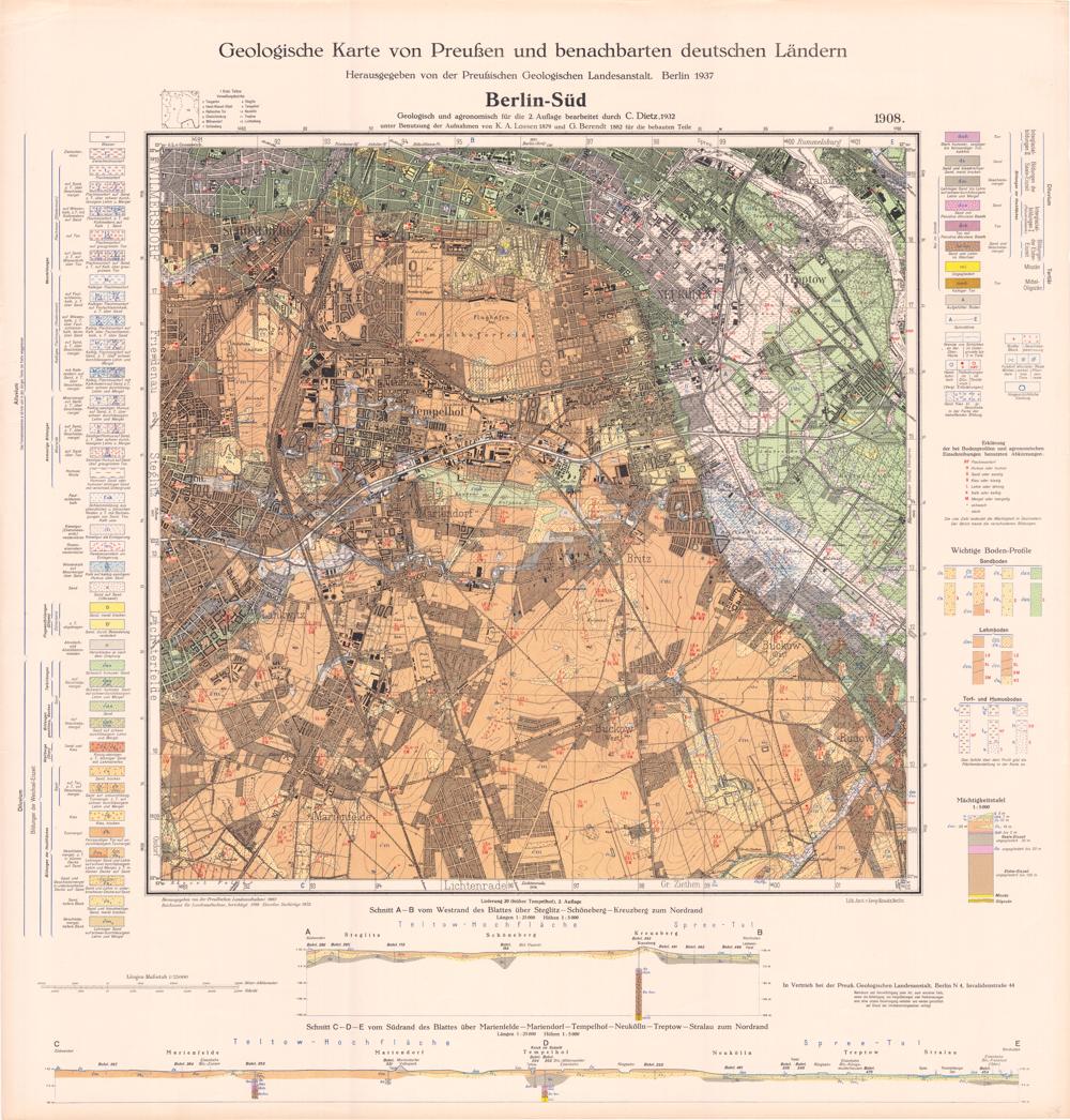 1908 = [Neue Nr. 3546] (1937) Berlin-Süd / geolog. u. agronom. für die 2. Aufl. bearb. durch C. Dietz, 1932 ; unter Benutzung der Aufnahmen von K. A. Lossen 1879 u. G. Berendt 1882 für die bebauten Teile