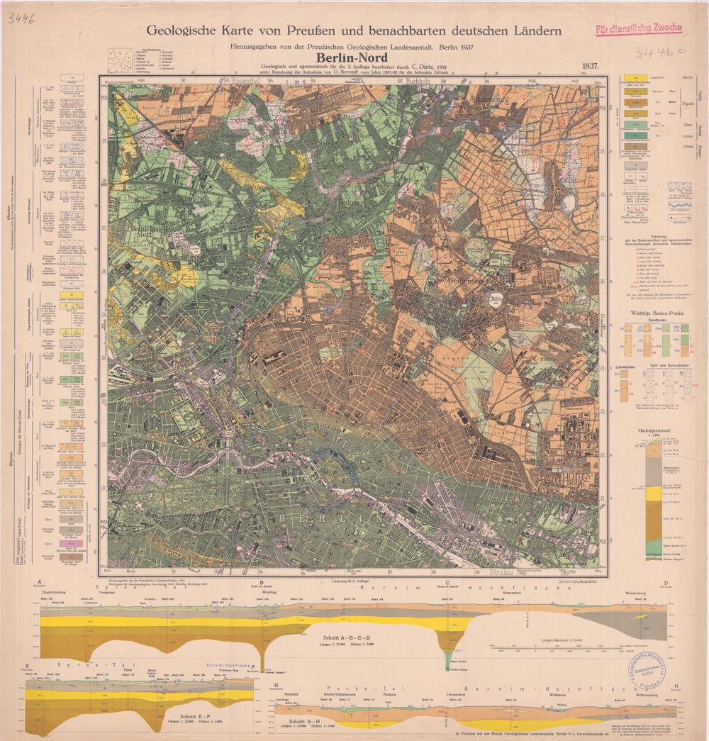 1837 = [Neue Nr. 3446] (1937) Berlin-Nord : [geologische Karte] / geolog. und agronom. für die 2. Aufl. bearb. durch C. Dietz ; unter Benutzung der Aufnahme von G. Berendt vom Jahre 1881/82 für die bebauten Gebiete