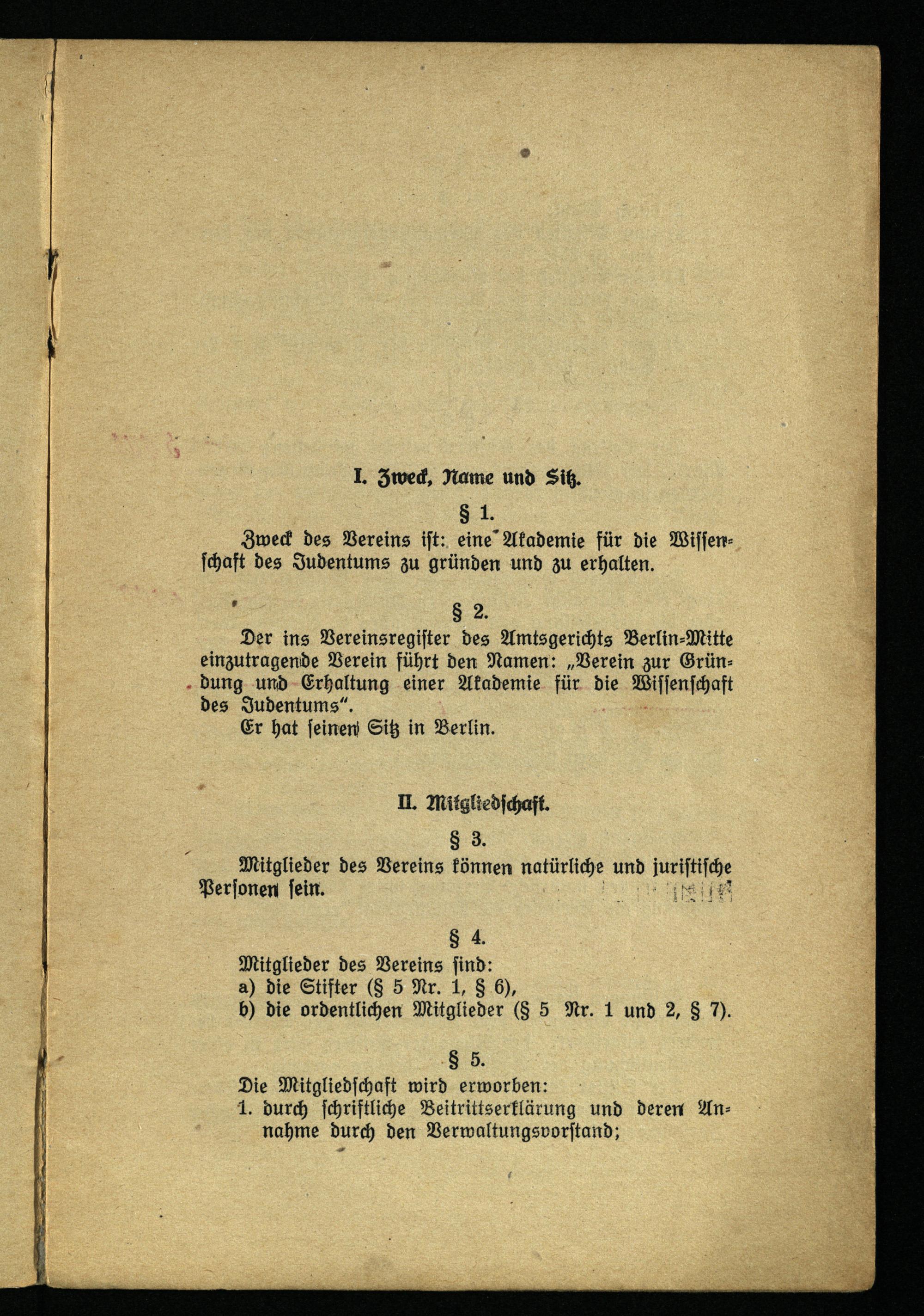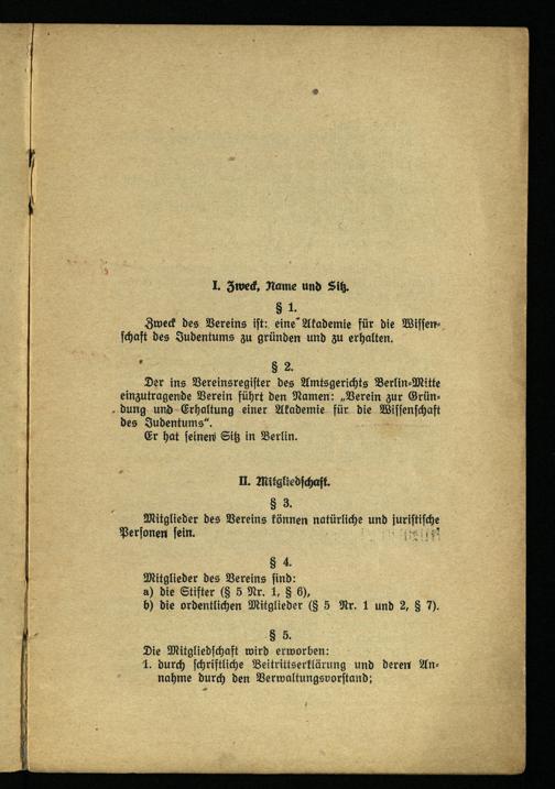 Satzung des Vereins zur Gründung und Erhaltung einer Akademie für die Wissenschaft des Judentums.