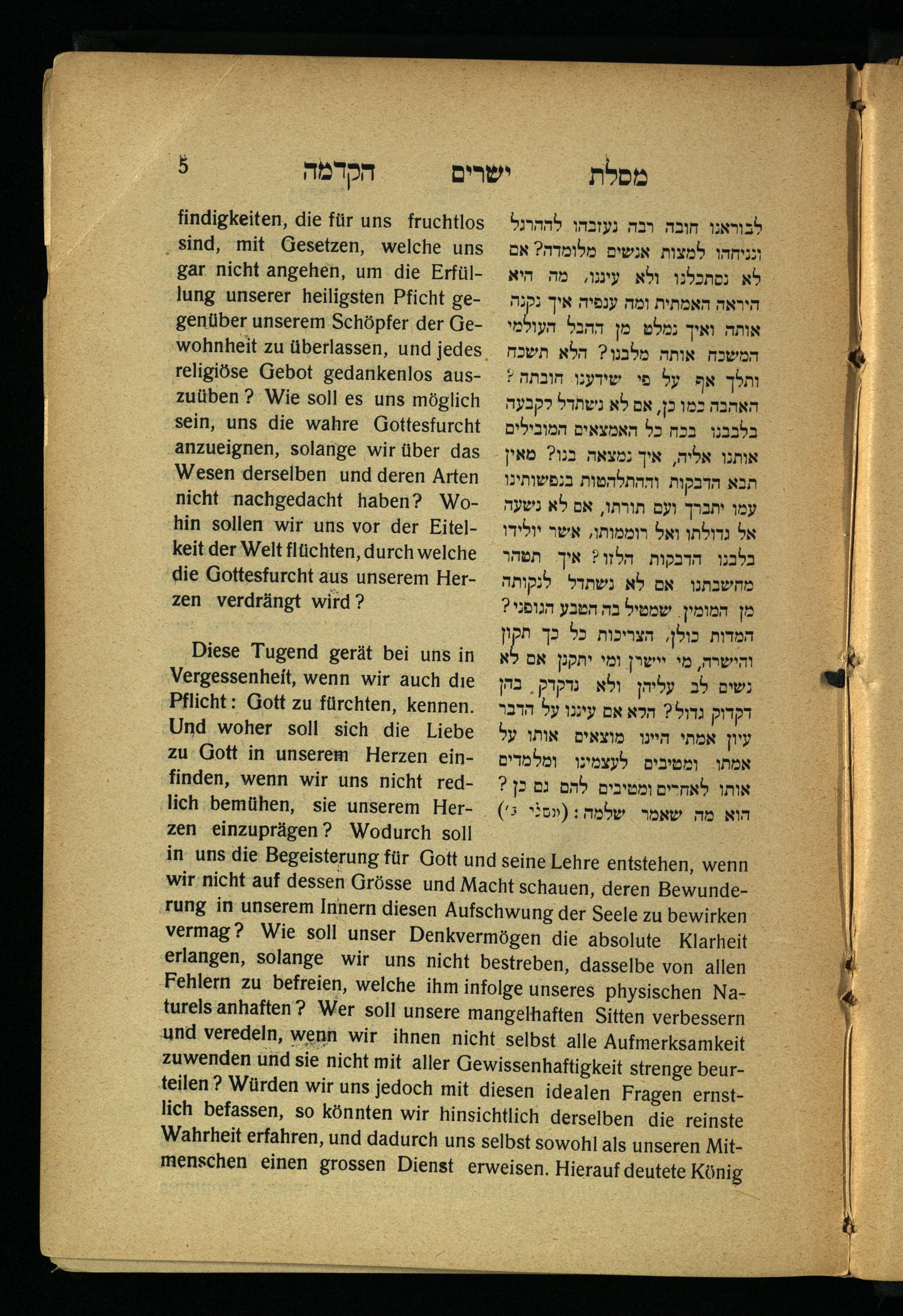 Lebensführung der Redlichen / von Mosche Chaim Luzzatto. Mit einer neben dem Text befindlichen dt. Übers. von Oskar Sachariasohn