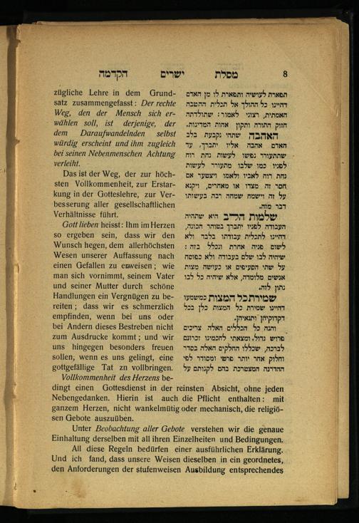 Lebensführung der Redlichen / von Mosche Chaim Luzzatto. Mit einer neben dem Text befindlichen dt. Übers. von Oskar Sachariasohn