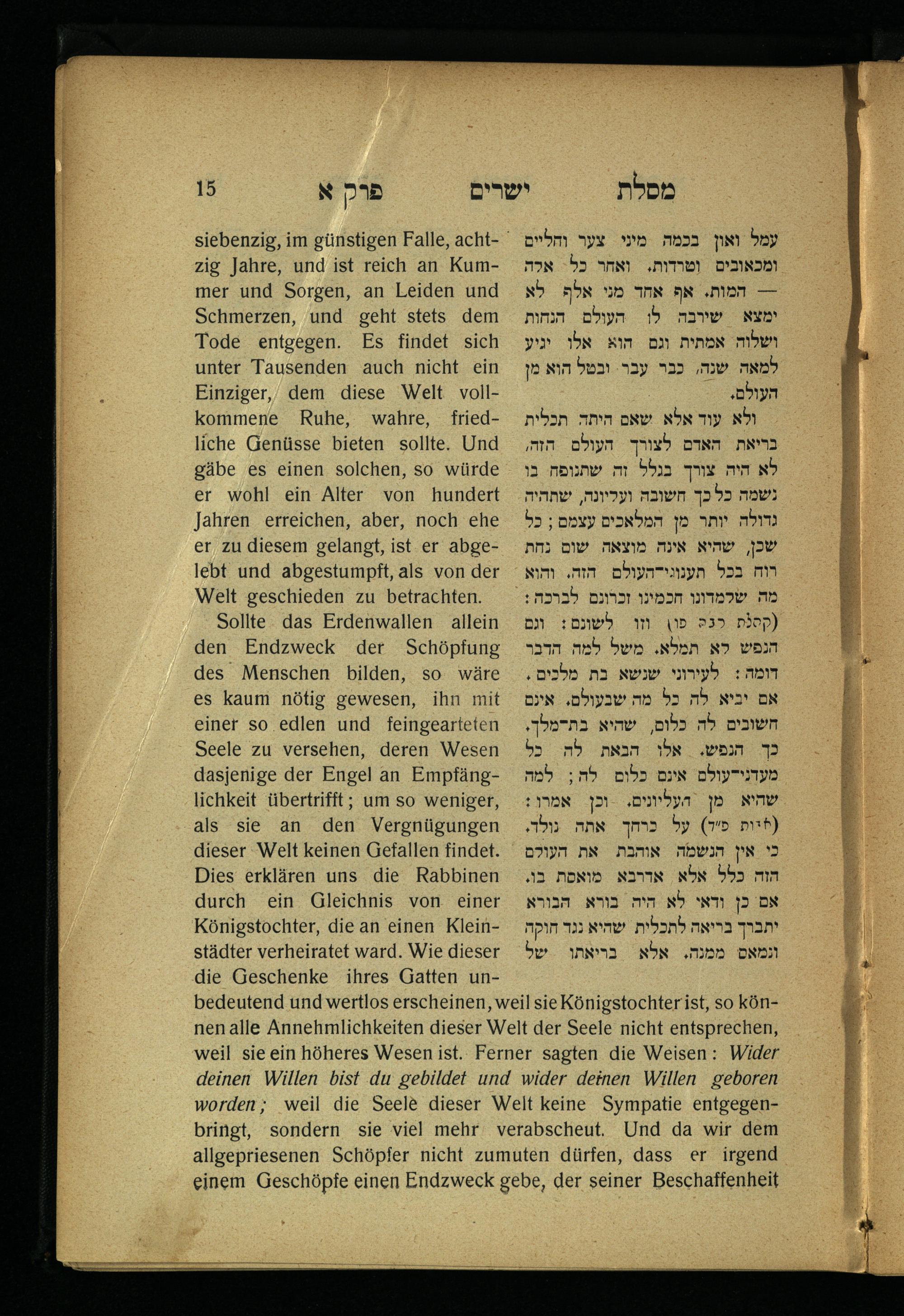 Lebensführung der Redlichen / von Mosche Chaim Luzzatto. Mit einer neben dem Text befindlichen dt. Übers. von Oskar Sachariasohn