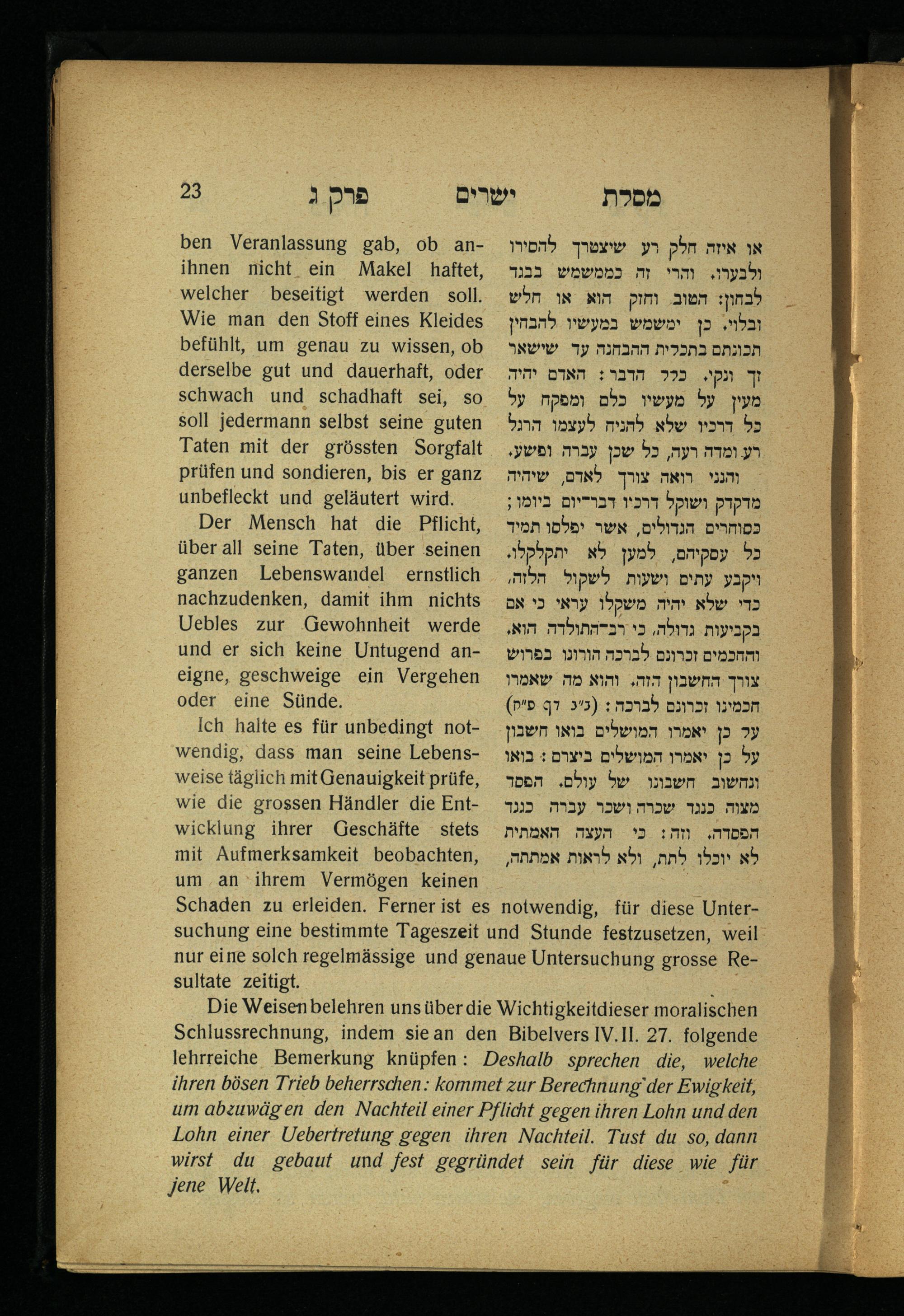 Lebensführung der Redlichen / von Mosche Chaim Luzzatto. Mit einer neben dem Text befindlichen dt. Übers. von Oskar Sachariasohn