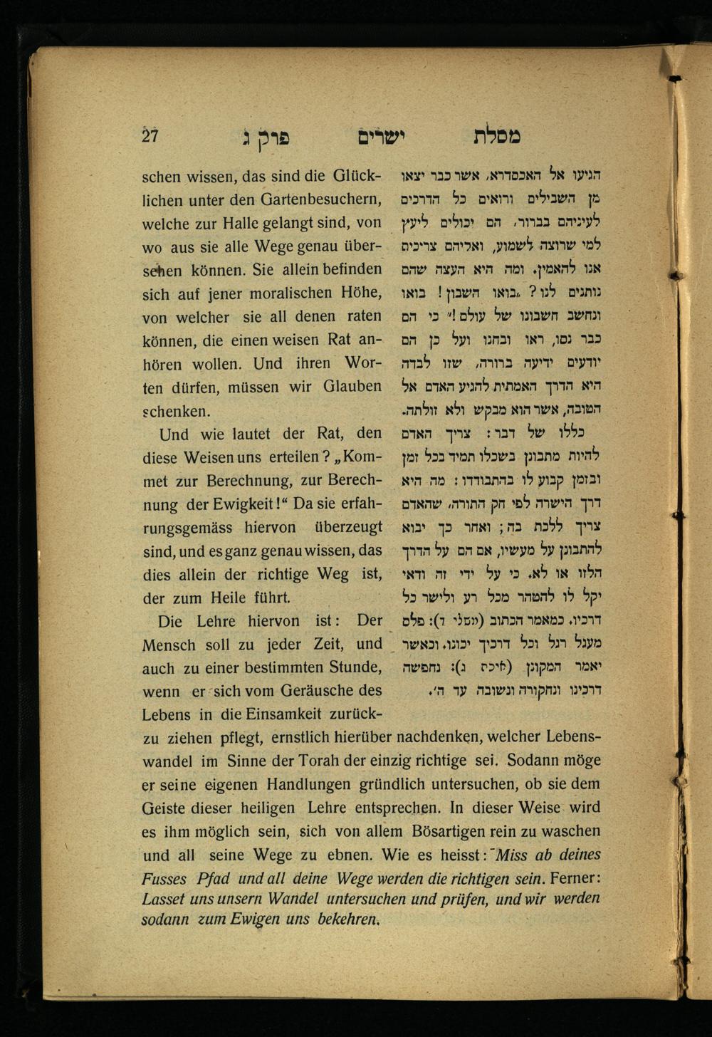 Lebensführung der Redlichen / von Mosche Chaim Luzzatto. Mit einer neben dem Text befindlichen dt. Übers. von Oskar Sachariasohn