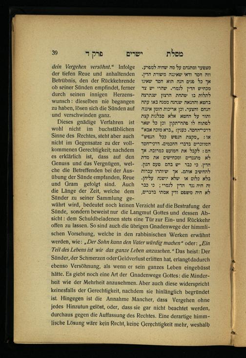 Lebensführung der Redlichen / von Mosche Chaim Luzzatto. Mit einer neben dem Text befindlichen dt. Übers. von Oskar Sachariasohn