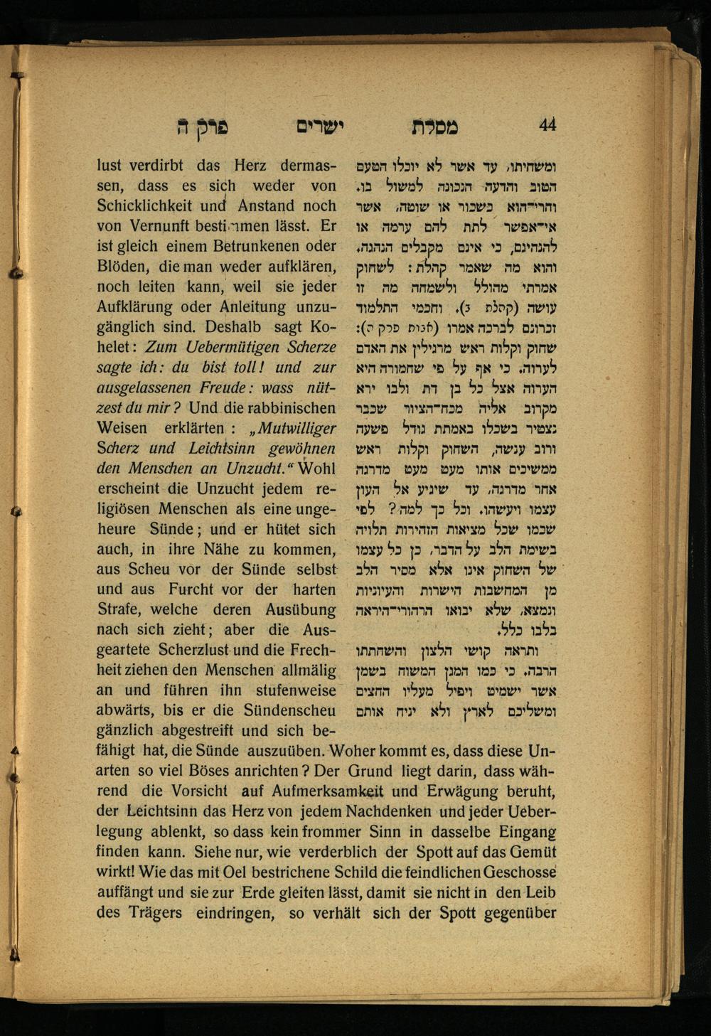 Lebensführung der Redlichen / von Mosche Chaim Luzzatto. Mit einer neben dem Text befindlichen dt. Übers. von Oskar Sachariasohn
