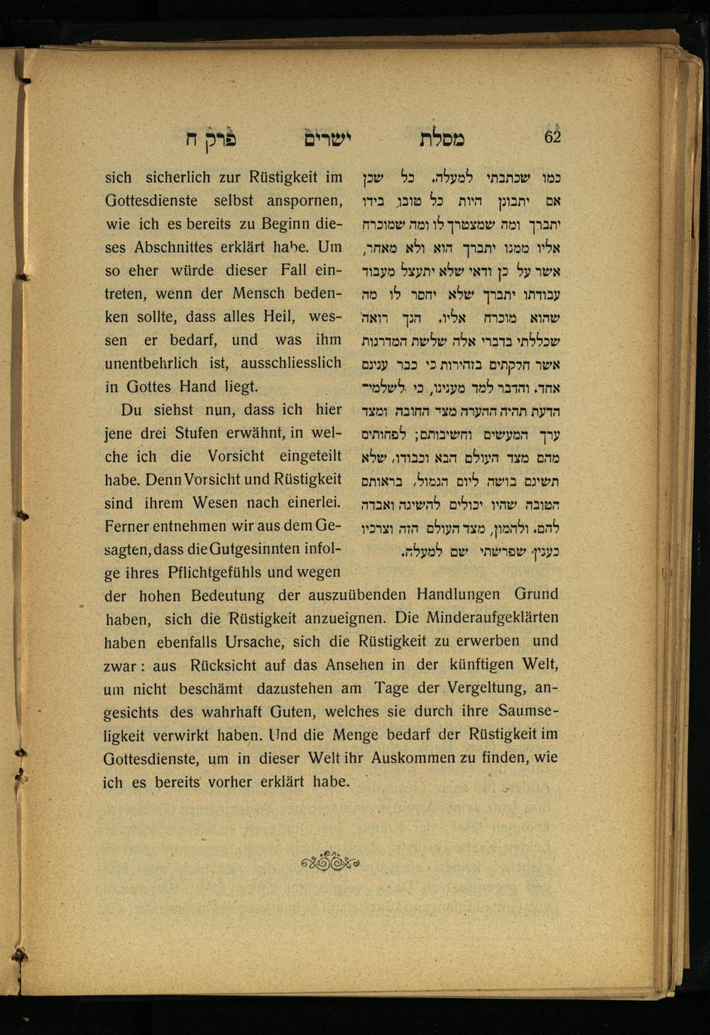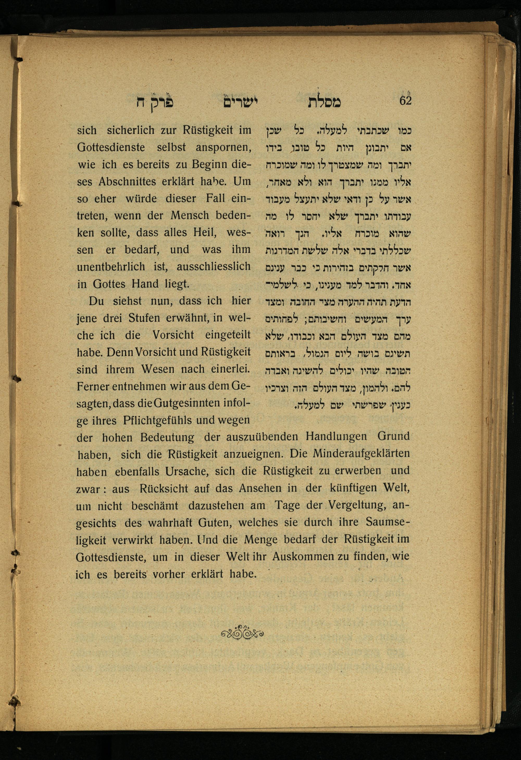 Lebensführung der Redlichen / von Mosche Chaim Luzzatto. Mit einer neben dem Text befindlichen dt. Übers. von Oskar Sachariasohn